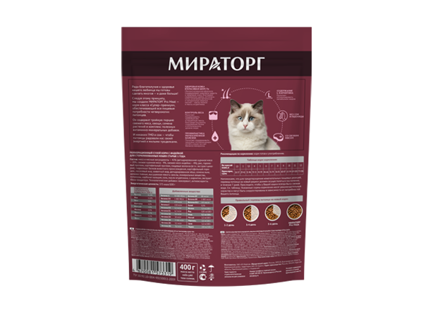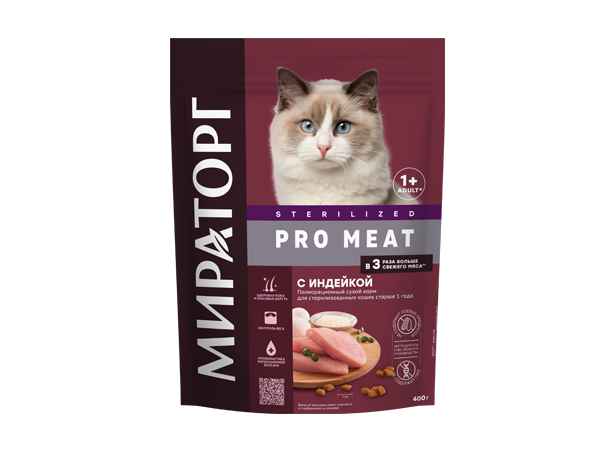 После стерилизации у кошек и кастрации у котов изменяется гормональный фон, что влияет на весь организм и способствует снижению активности и появлению избыточной массы тела у питомцев. Специальный корм PRO MEAT — источник легкоусвояемого белка со свежим мясом индейки и полезных натуральных ингредиентов. Рыбий жир и семена льна придадут блеск шерсти, а минеральный комплекс из кальция, фосфора и магния снизит риск возникновения мочекаменной болезни. Добавление L-карнитина, участвующего в жировом обмене, поможет питомцу сохранять прекрасную физическую форму.