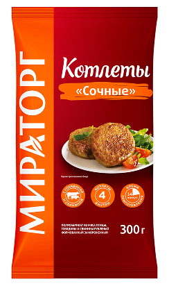 «Сочные» котлеты с аппетитной румяной корочкой «Мираторг» готовит по своему авторскому рецепту, используя в составе фарш из четырёх видов вкуснейшего свежего мяса. Готовить котлеты легко и быстро, они получаются одинаково вкусными как на сковороде, так и в духовке. Их соблазнительный аромат соберёт всю семью за вкусным обедом или питательным ужином. Выбирайте любимый гарнир - это может быть гречка, макароны, картофельное пюре или запечённые овощи - и наслаждайтесь.