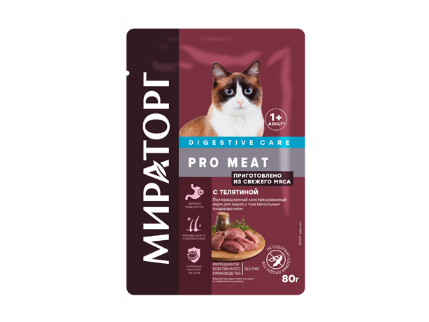Пищеварительная система кошек может быть чувствительной к составу корма. Специально для таких питомцев компания Мирторг создала консервированный корм PRO MEAT с телятиной. Аппетитный соус, диетическая телятина, комплекс витаминов, минералов и пребиотических волокон поддержат пищеварение питомца с учетом его индивидуальных особенностей.