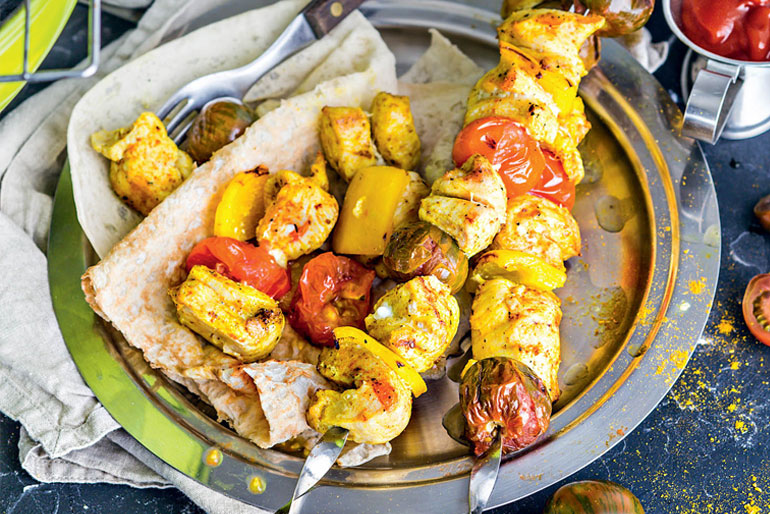 - Разожгите угли в мангале – они должны хорошо прогореть и подернуться седым пеплом. Установите на мангале шампуры и жарьте шашлычки, поворачивая, до готовности куриного мяса, 10–12 мин. Дайте мясу «отдох-нуть» на шампурах, 5–7 мин. Подавайте с лавашом.