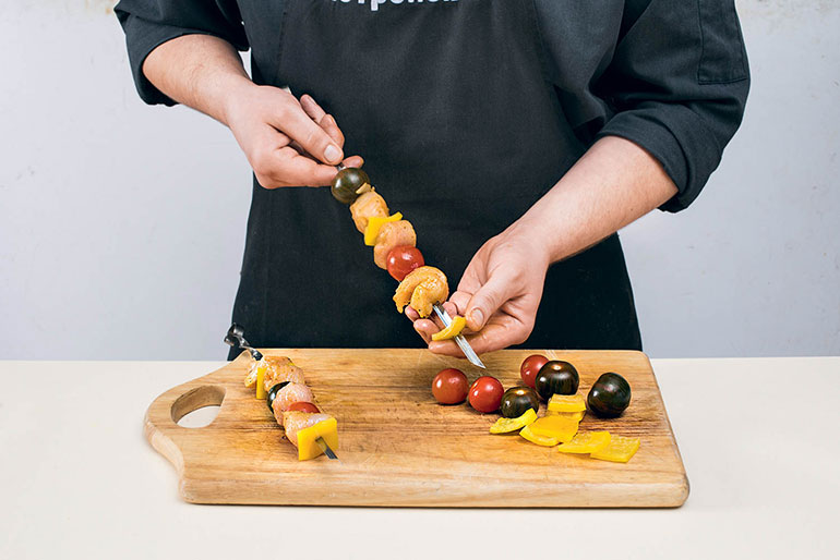 - Перец очистите, нарежьте кусочками 2х2 см, посолите, смажьте маслом. Нанижите на тонкие шампуры курицу, перец и черри, чередуя их. В начале и в конце шампуров лучше нанизать перец.
