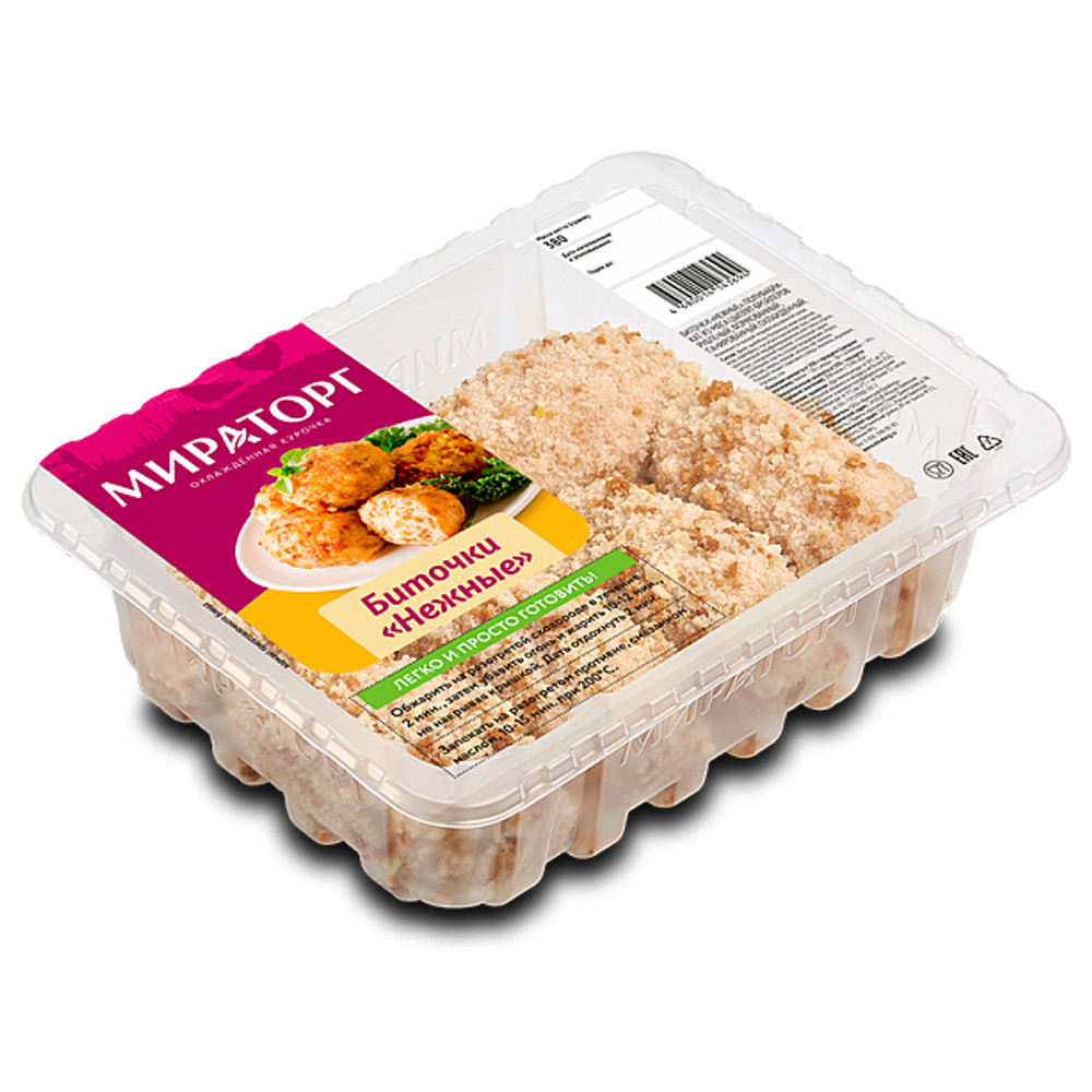 Нежные куриные биточки с начинкой из натурального картофеля в хрустящей панировке изготавливаются из мяса цыплят собственного производства. Современная упаковка позволяет сохранить вкус и свежесть блюда в течение всего срока годности.