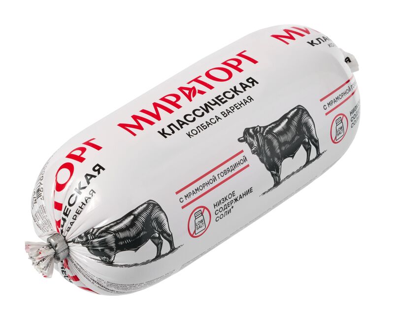 Вареная колбаса "Классическая" приготовлена из сырья собственного производства: свинины, мраморной говядины Black Angus и курицы с добавлением специально подобранных специй и пряностей. Отличается нежным вкусом с пикантными нотками мускатного ореха.