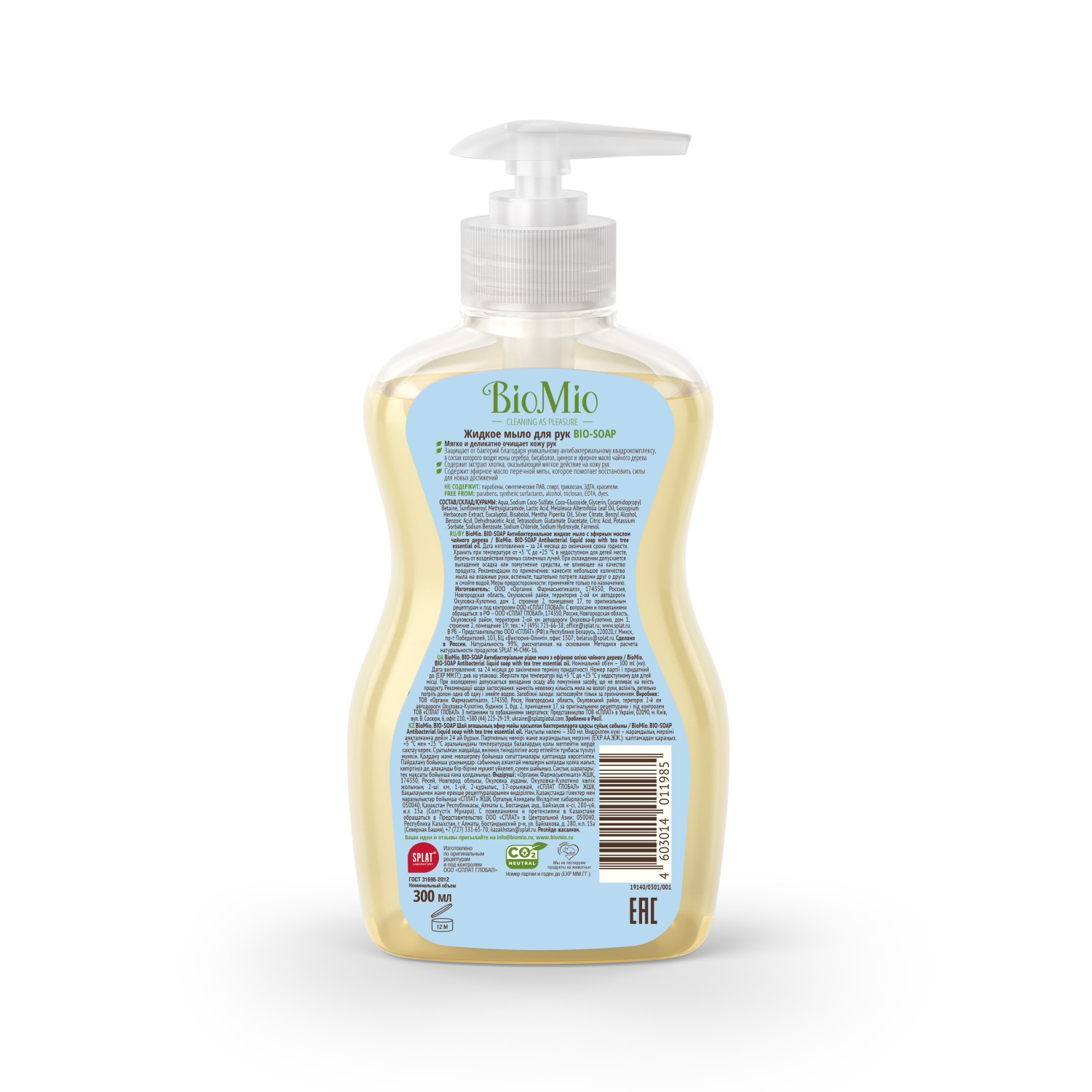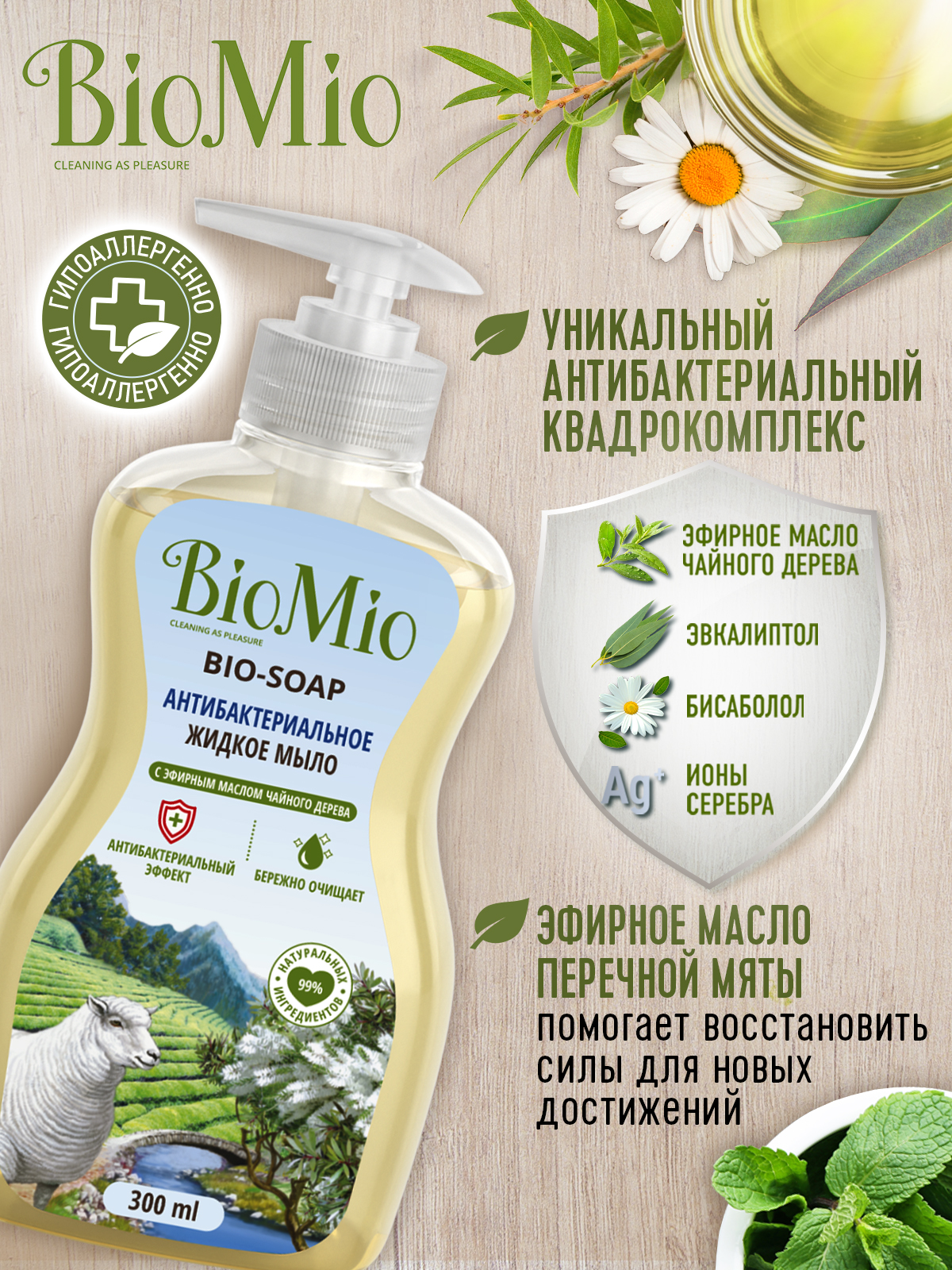 Экологичное антибактериальное жидкое мыло BIO-SOAP с эфирным маслом чайного дерева мягко и деликатно очищает кожу рук, обеспечивая надежную защиту от бактерий благодаря уникальному антибактериальному квадрокомплексу, в состав которого входят ионы серебра, бисаболол, эвкалиптол и эфирное масло чайного дерева.