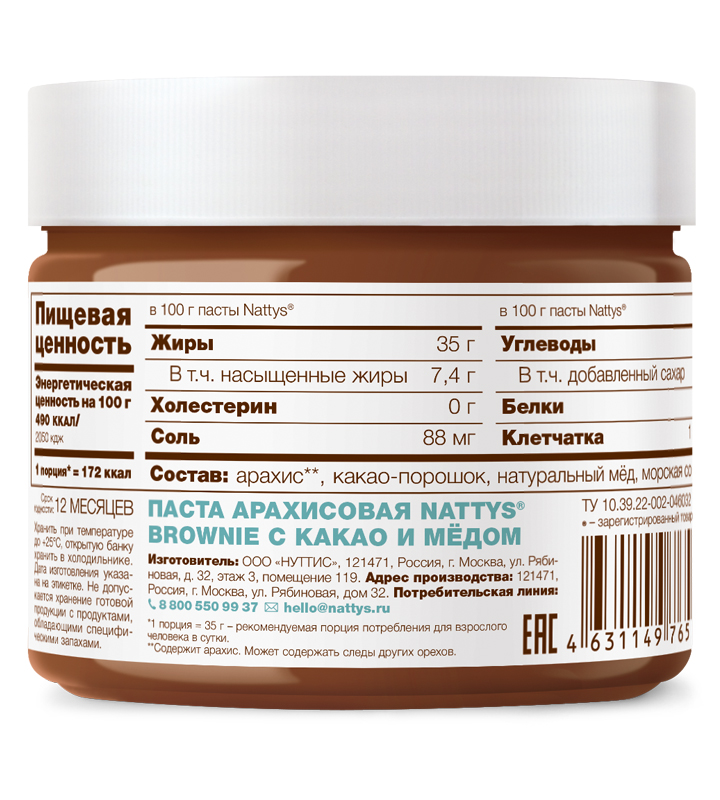 Паста арахисовая Brownie с какао и мёдом 325г Nattys