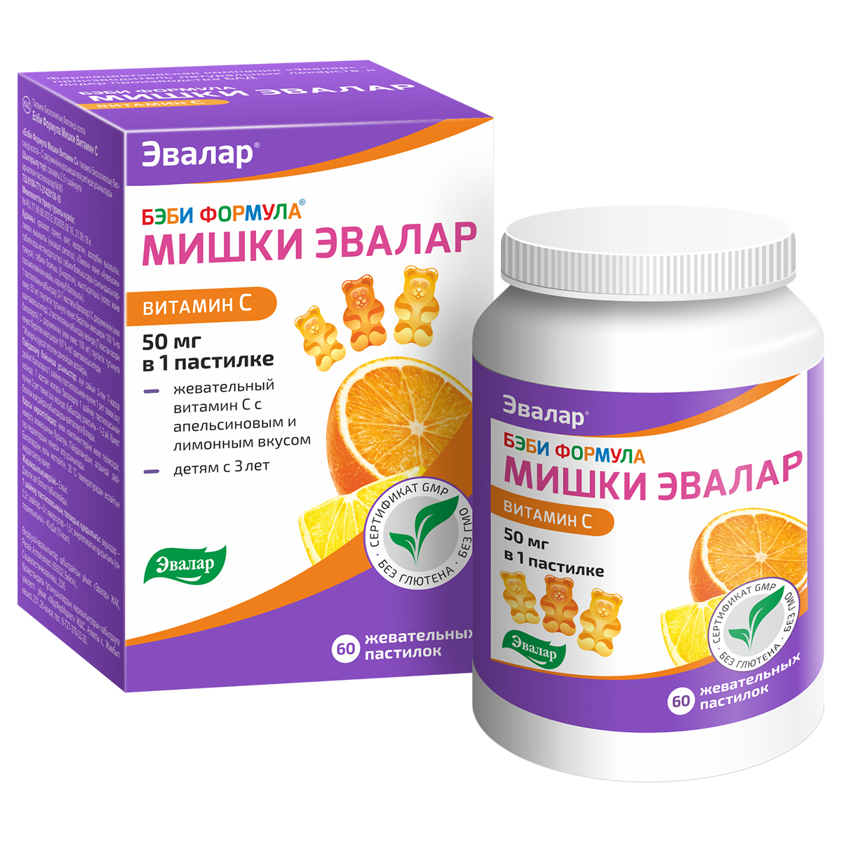 Специально для восполнения недостатка витамина С и поддержания его уровня для детей с 3 лет компания «Эвалар» разработала витаминный препарат Бэби Формула Мишки Витамин С в форме вкусных мармеладных мишек. Каждая пастилка содержит 100% суточной нормы витамина С – 50 мг.
