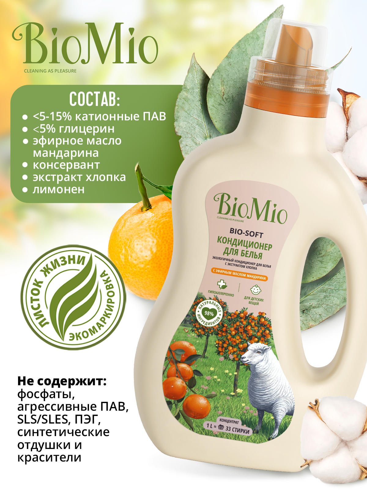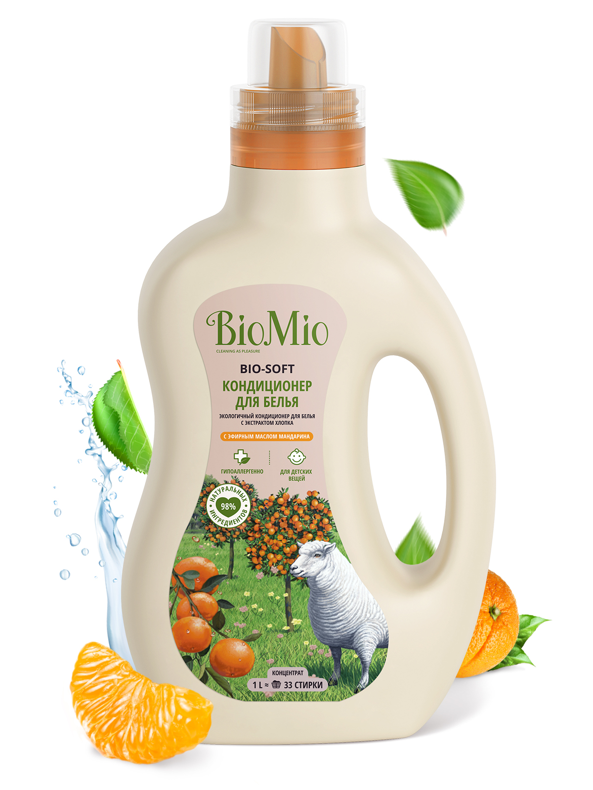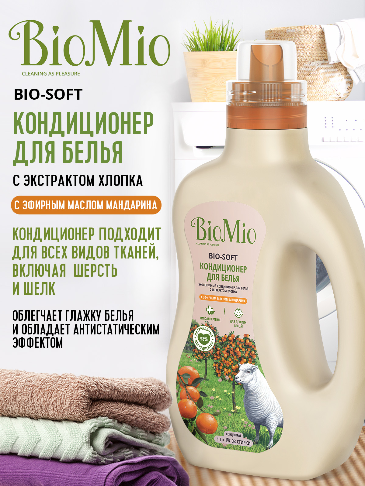 Экологичный кондиционер для белья BIO-SOFT с эфирным маслом мандарина эффективно и безопасно действует на волокна ткани, облегчает глажку белья и обладает антистатическим эффектом.