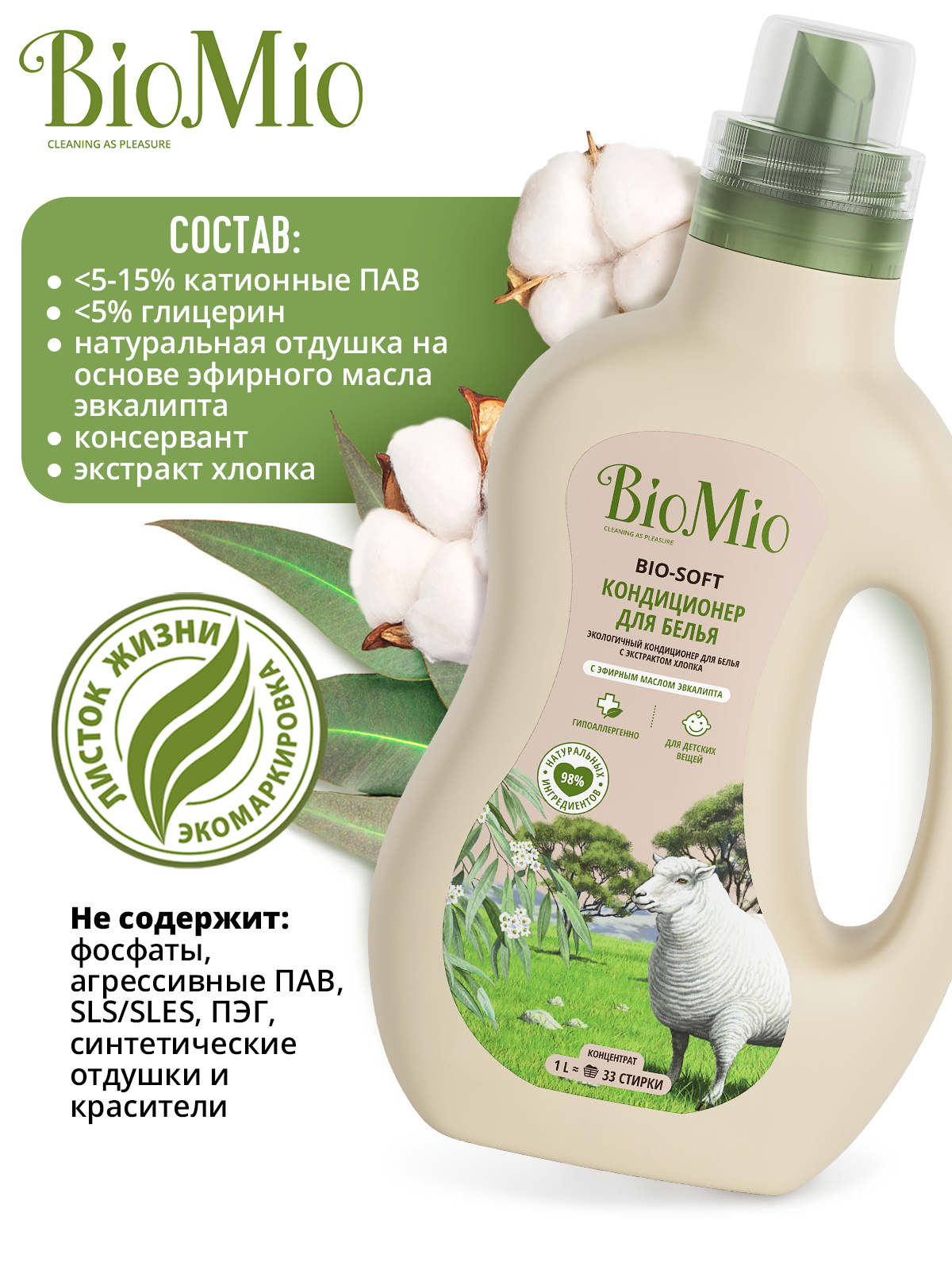 Экологичный кондиционер для белья BIO-SOFT с эфирным маслом эвкалипта эффективно и безопасно действует на волокна ткани, облегчает глажку белья и обладает антистатическим эффектом.
