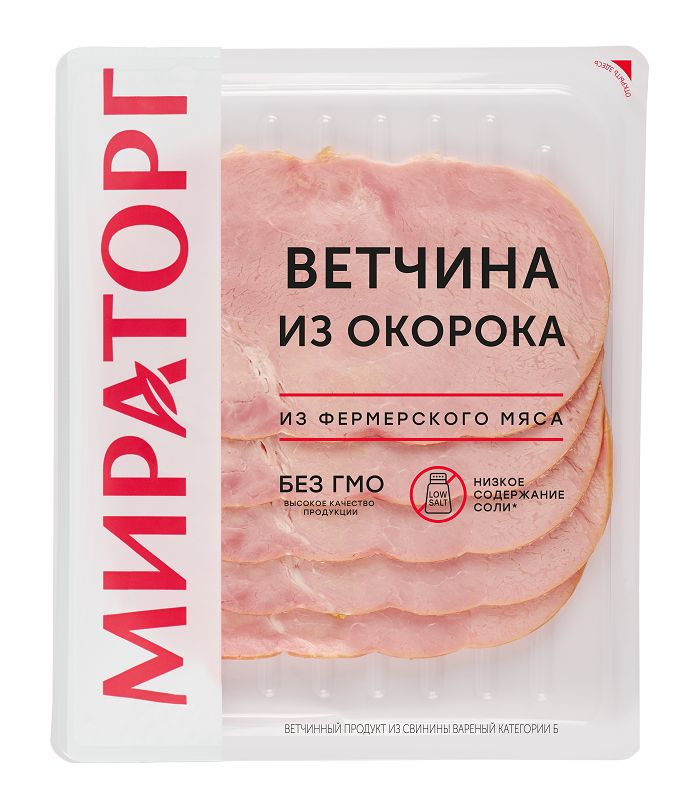 Ветчина "Из окорока" от Мираторг приготовлена из нежного свиного окорока и отличается натуральным мясным вкусом, подчеркнутым тонким ароматом копчения. На срезе видны крупные куски мясного филе. Тонкие полупрозрачные ломтики ветчины станут идеальной основой любого блюда.