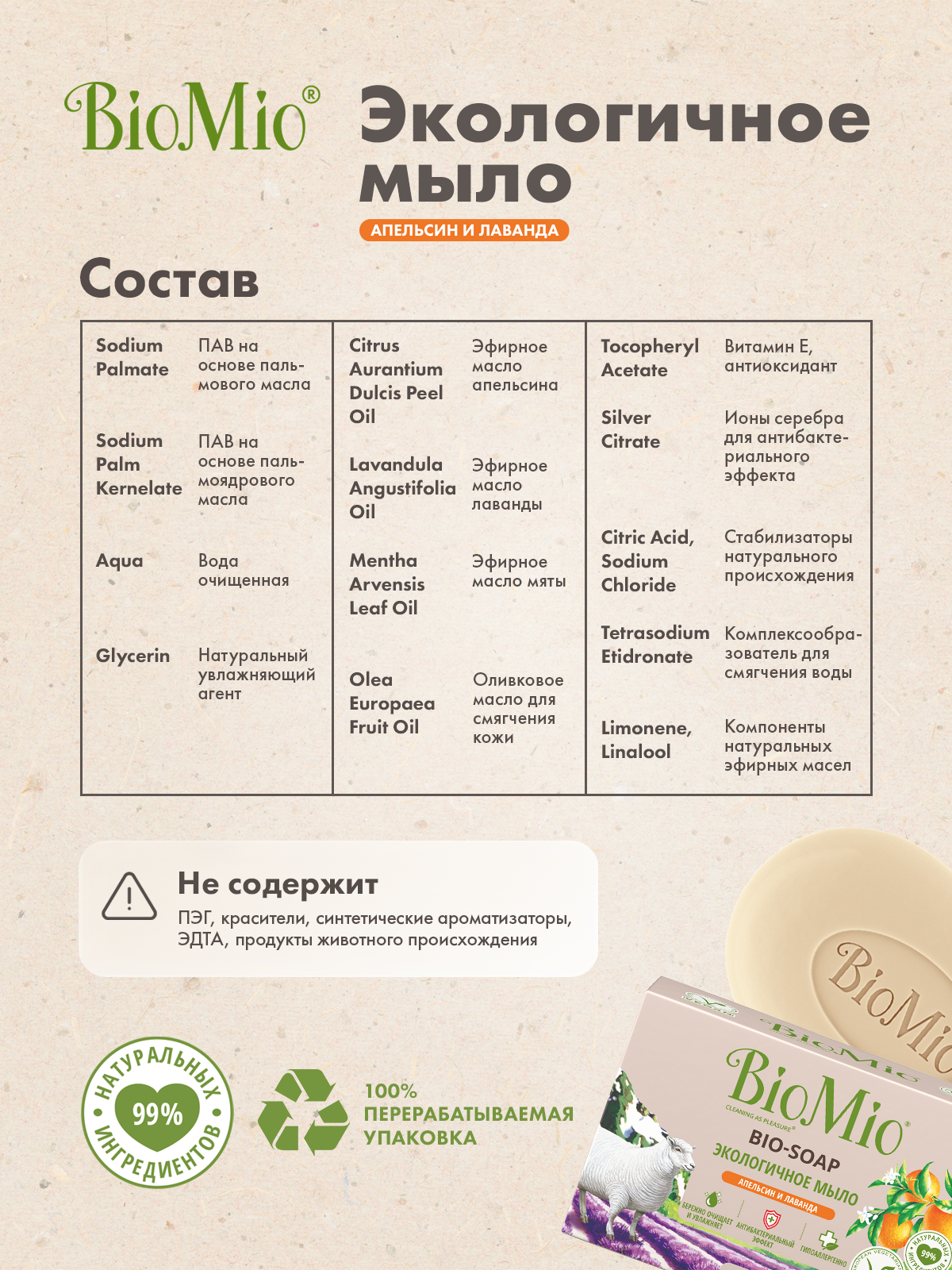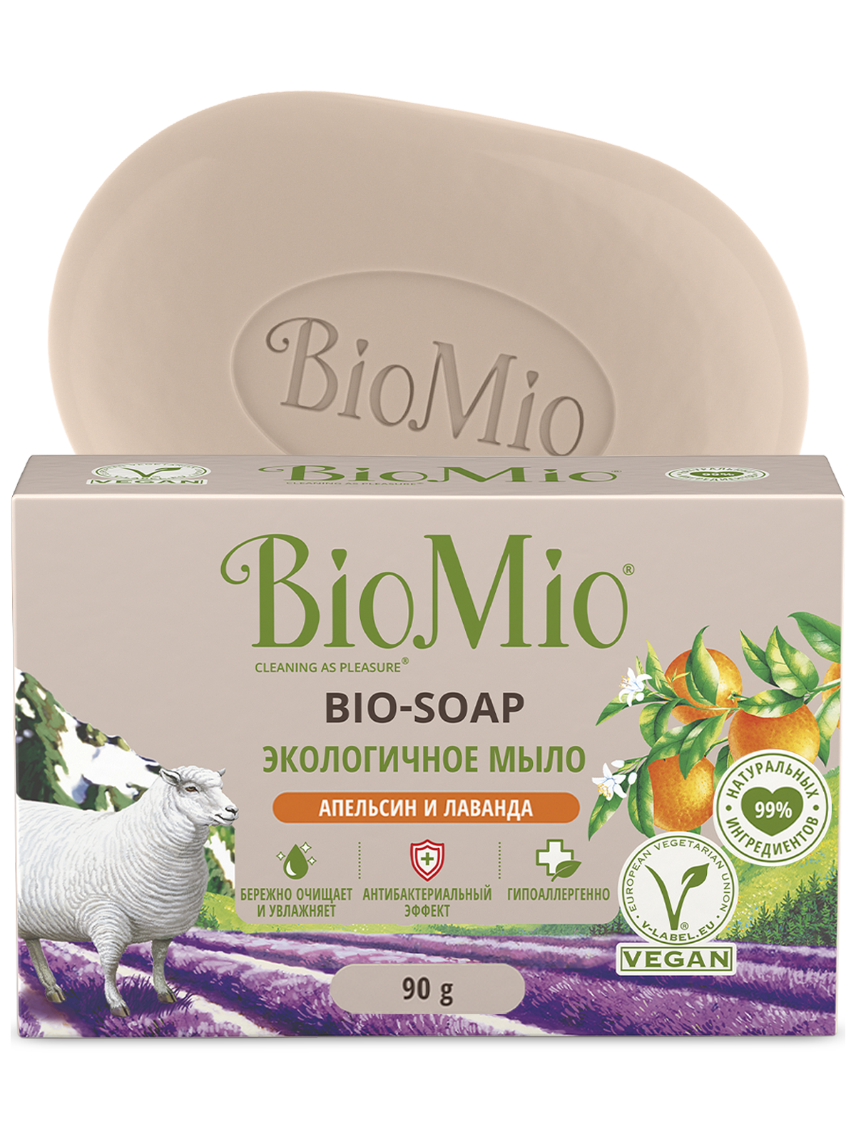 Экологичное туалетное мыло BIO-SOAP с эфирными маслами лаванды, мяты перечной и апельсина - 100% вегетарианское – в его составе не содержатся компоненты животного происхождения.