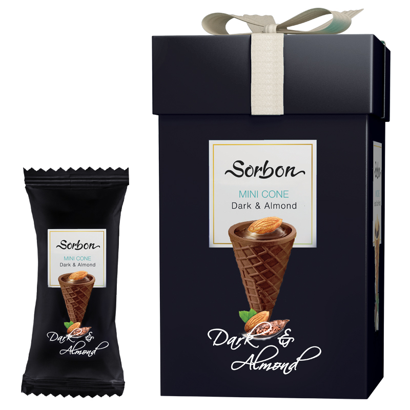 Шоколадные конфеты с орехом подарочные в коробке с бантом ассорти Sorbon (mini cone) "Миндаль" 200 гр - это хрустящий вафельный рожок и шоколадная начинка с миндалем. Традиционные восточные сладости могут стать отличным подарком на праздник и просто так порадовать друзей и близких. Набор конфет не содержит красителей и ГМО. Каждая конфета запечатана в индивидуальную упаковку. Коробки конфет хватит для душевного чаепития на целую компанию.