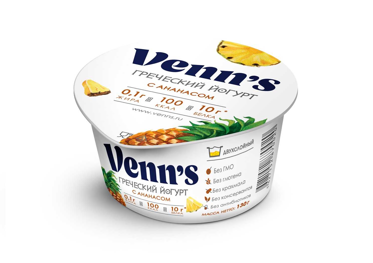Venn's - это линейка продуктов на основе аутентичного греческого йогурта. Во всех продуктах Venn's используются только простые ингредиенты: обезжиренное молоко высшего сорта, уникальное сочетание заквасочных культур и пробиотиков, натуральные фруктово-ягодные наполнители. Кусочки спелого ананаса, укрытые густым греческим йогуртом Venn's. Естественным образом насыщенный белком, этот йогурт отлично подойдет в качестве завтрака и другого перекуса в течение дня, оставив после себя только нежное послевкусие - но никаких калорий!