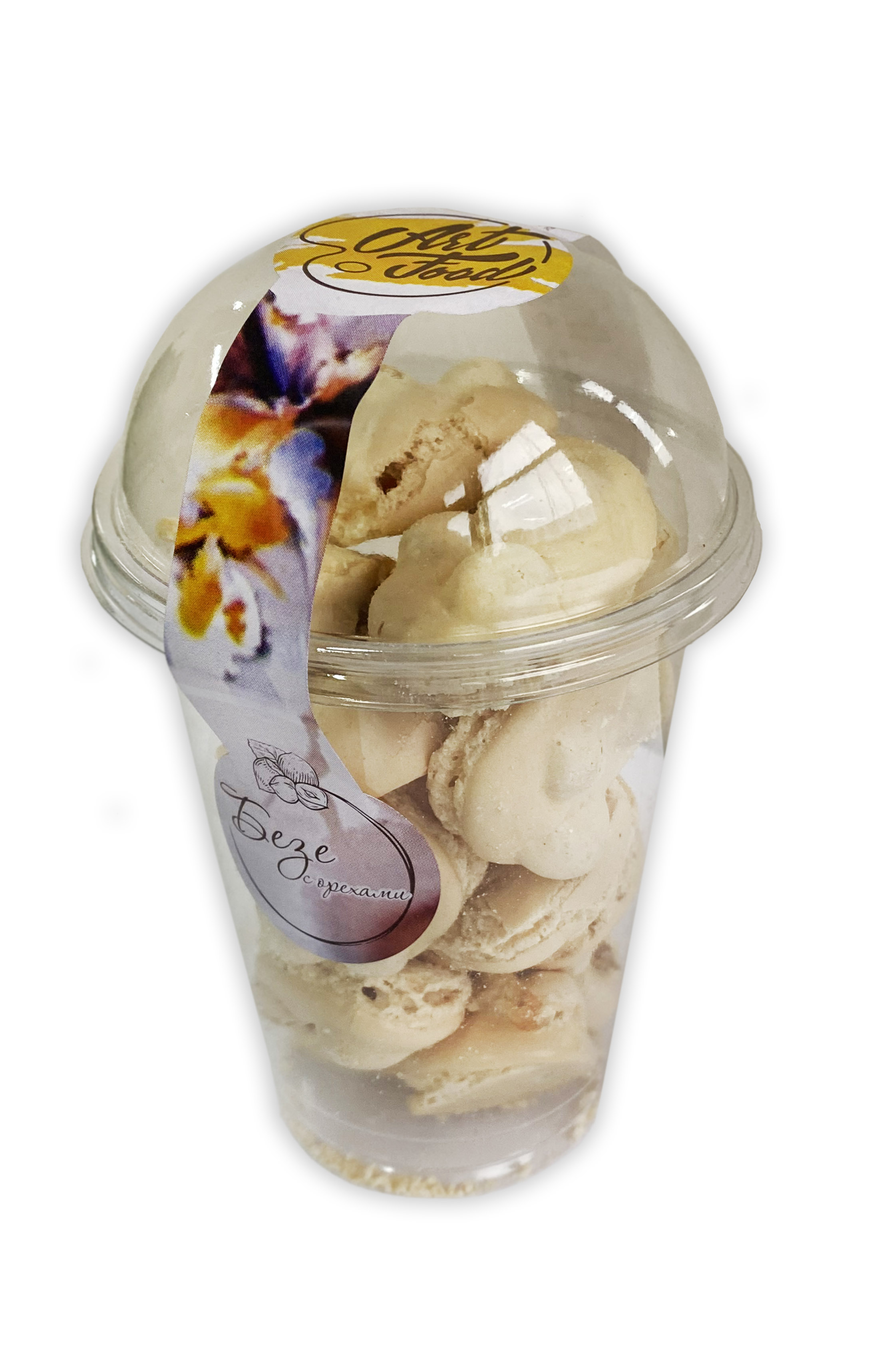Воздушное, нежное, деликатно хрустящее безе приготовлено по классическому рецепту из взбитых в пену яичных белков и сахара, запеченых в духовке до вкуса крем-брюле. Прослойка из дробленого лесного ореха првращает это безе в лакомство для гурманов и сладкоежек.