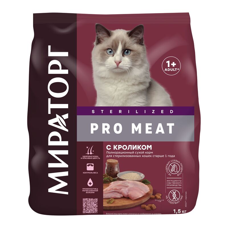 После кастрации и стерилизации предрасположенность кошек к появлению избыточной массы тела и мочекаменной болезни возрастает. С учетом этих особенностей был создан полнорационный корм PRO MEAT. Умеренное содержание калорий, баланс минералов и свежее мясо в составе снизят вероятность появление лишнего веса и мочекаменной болезни.