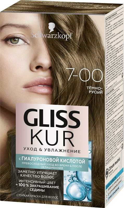 Стойкая краска для волос Gliss Kur Уход & Увлажнение с гиалуроновой кислотой 7-00 Темно-русый. Превосходный уход во время и после окрашивания.