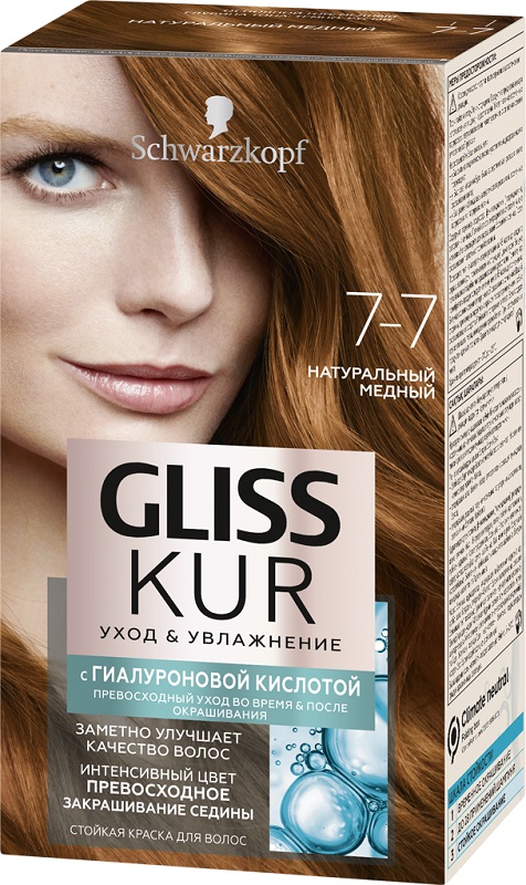 Стойкая краска для волос Gliss Kur Уход & Увлажнение с гиалуроновой кислотой 7-7 Натуральный медный. Превосходный уход во время и после окрашивания.