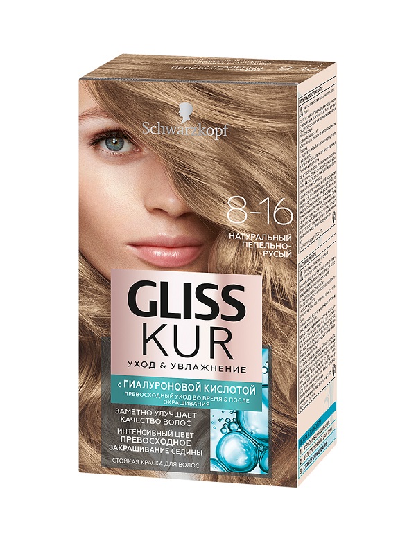 Стойкая краска для волос Gliss Kur Уход & Увлажнение с гиалуроновой кислотой 8-16 Натуральный пепельно-русый. Превосходный уход во время и после окрашивания.