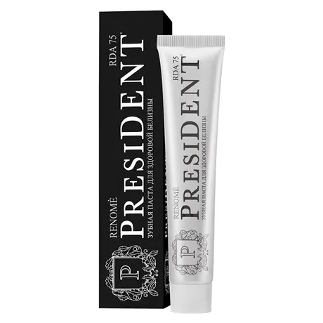 Зубная паста PRESIDENT Renome RDA 75* предназначена для бережного отбеливания зубов. Зубная паста рекомендована для закрепления эффекта профессиональной чистки у стоматолога, не содержит жестких абразивных компонентов и пероксидных соединений. Кальций-кремниевая композиция эффективно очищает эмаль и бережно удаляет налет. Женьшень оказывает тонизирующее действие. Фтор укрепляет эмаль и защищает от образования кариеса. Мята освежает дыхание. Эффективность зубной пасты клинически доказана: уменьшает количество налета на 62%, а также пигментированного налета на 53% *RDA – это строгий контроль размера и концентрации абразивных частиц. Специально подобранные абразивы безопасно и эффективно удаляют налет, очищают и полируют зубную эмаль. Чем выше абразивность зубной пасты, тем лучше она будет счищать с поверхности эмали бактериальный и пигментированный налет. Применение: ежедневно, после каждого приема пищи, не менее двух раз в день.