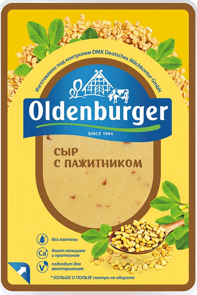 Сыр oldenburger с пажитником имеет в меру пряный вкус с легким ореховым оттенком. Пажитник – это пряность с ценным биохимическим составом, действует на организм как общеукрепляющее, тонизирующее и восстанавливающее средство.