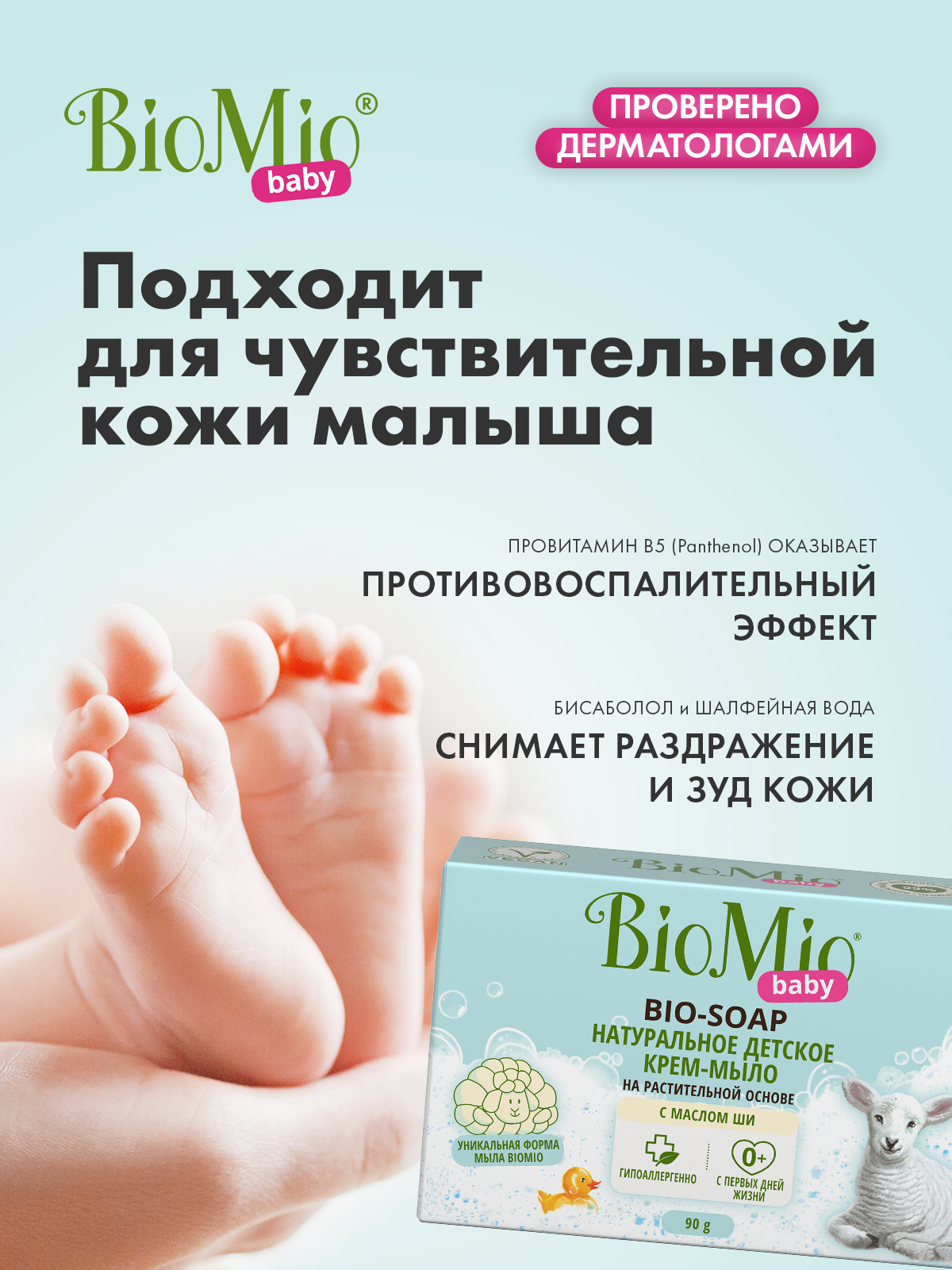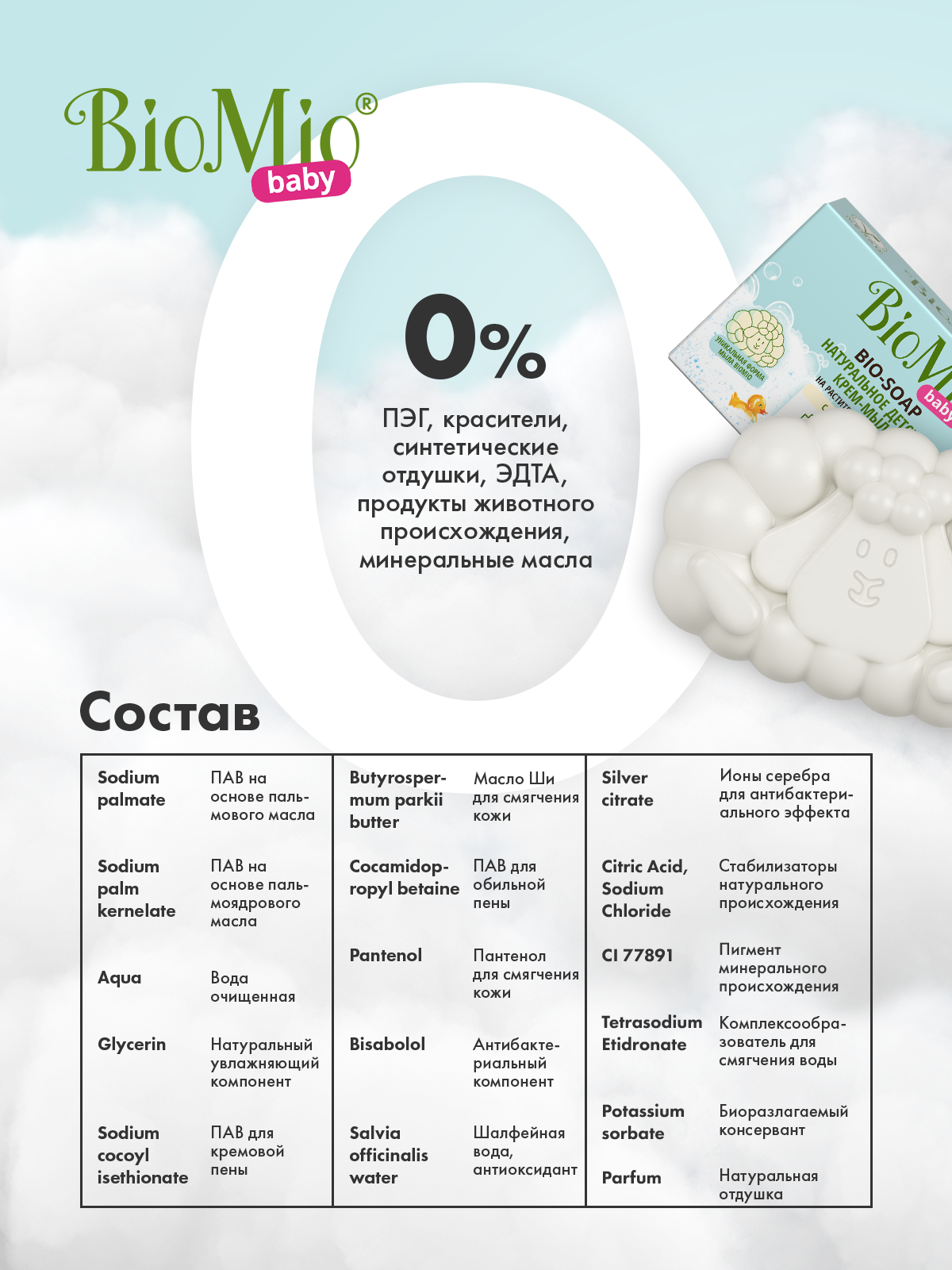 Натуральное детское мыло в форме овечки BioMio Baby BIO-SOAP предназначено для использования с самых первых дней жизни. В составе масло ши и провитамин В5, которые увлажняют, питают и смягчают кожу. Ионы серебра и бисаболол придают антибактериальные свойства. Шалфейная вода успокаивает раздраженную кожу. Нежнейшая биомиметическая пена очищает от макушки до пяточек, не нарушая естественный липидный слой, а после смывания не оставляет пленки, сухости и ощущения стянутости. Идеально для кожи малыша!