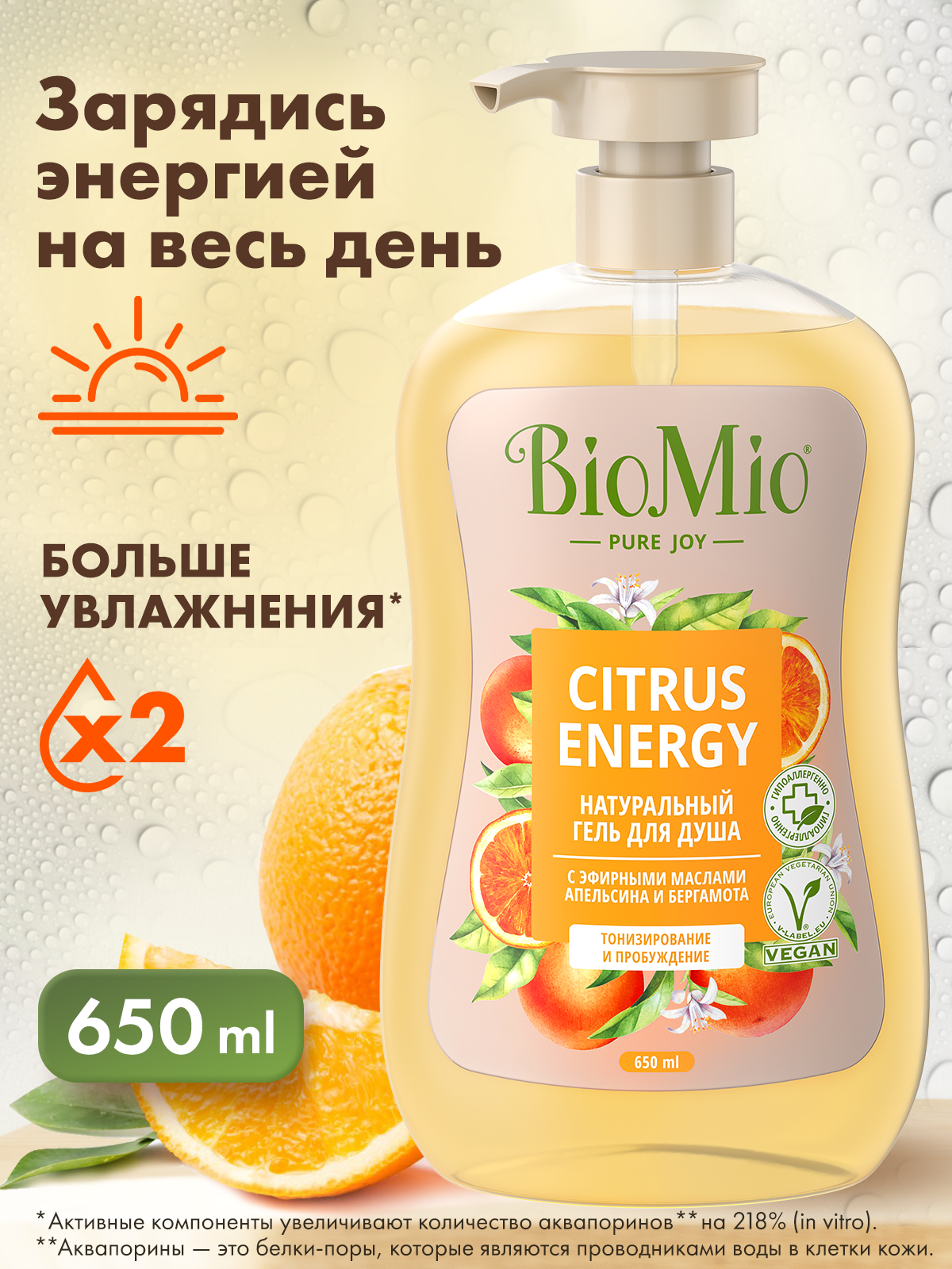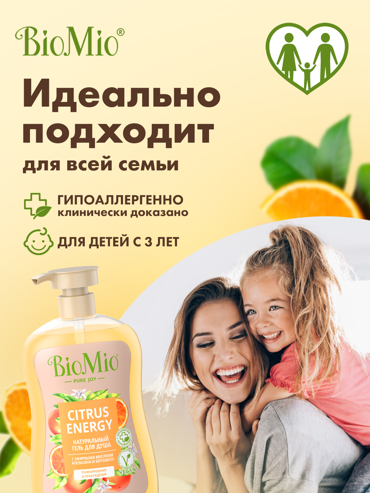 Натуральный гель для душа BIOMIO. Увлажняет кожу. Не оставляет чувство стянутости. Поддерживает сбалансированный рН кожи для микробиома. Мягко очищает. Для всей семьи (для детей от 3 лет). Подходит для утреннего ритуала перед началом дня. Эфирные масла апельсина и бергамота улучшают настроение и придают бодрость. 98% всех ингредиентов натурального происхождения. НЕ СОДЕРЖИТ: SLES, минеральные масла, силиконы, PEG/PPG, ЭДТА, парабены, синтетические отдушки и красители.