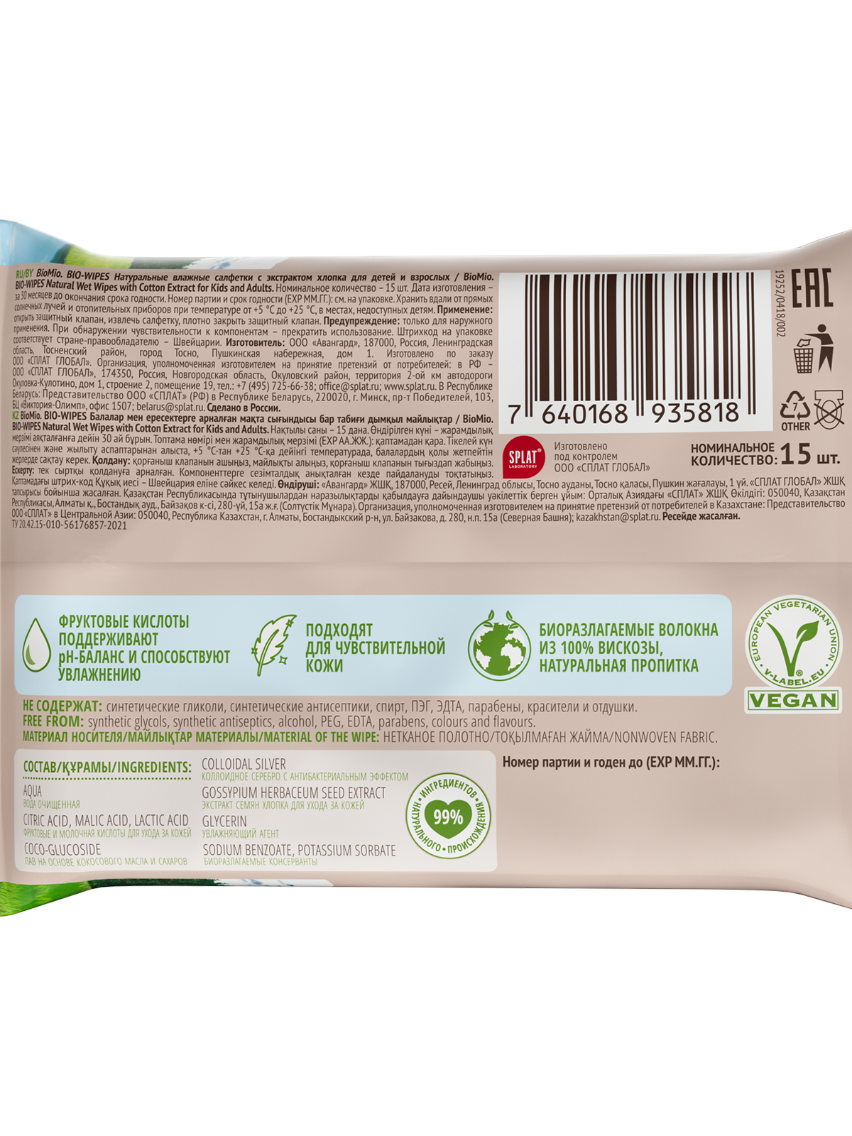 Натуральные влажные салфетки BioMio разработаны для чувствительной кожи взрослых и детей (0+). Основа салфеток - полностью биоразлагаемый материал. Пропитка на 98% состоит из чистой воды. Также в составе уникальная комбинация органических кислот, которые бережно очищают и поддерживают нормальный pH. Коллоидное серебро оказывает антибактериальный эффект. Экстракт хлопка смягчает кожу. Гипоаллергенность продукта доказана клинически. Сертификат V-Label подтверждает отсутствие ингредиентов животного происхождения. В составе нет спирта, триклозана, минерального масла, PEG, EDTA, синтетических отдушек и красителей.