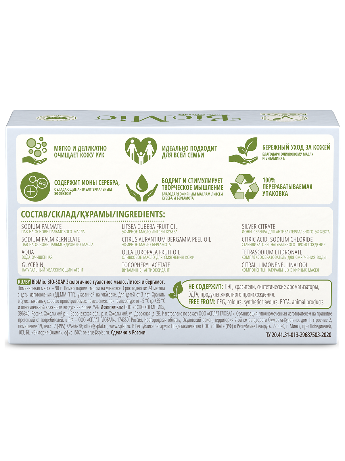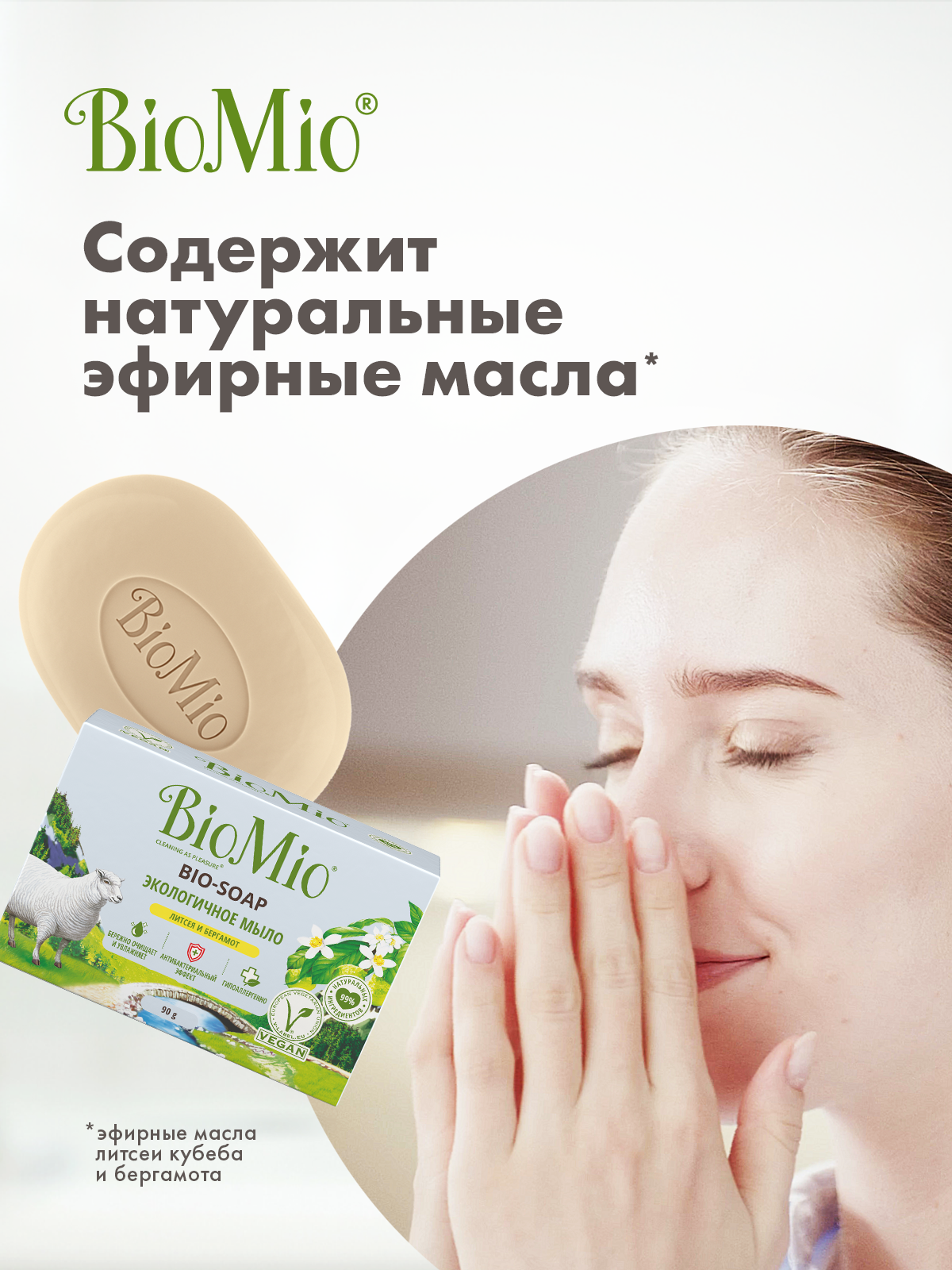 Экологичное гипоаллергенное мыло BioMio BIO-SOAP с эфирными маслами бергамота и литсея кубебы мягко очищает даже чувствительную кожу. Оливковое масло и витамин Е питают и смягчают ее. Ионы серебра придают мылу антибактериальный эффект. Эфирные масла бергамота и литсея кубебы с его леденцово-лимонным ароматом бодрят и освежают. Мыло BIO-SOAP не содержит компоненты животного происхождения, подходит для веганов.