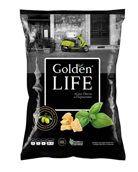 Оливковое масло богато антиоксидантами, витаминами и микроэлементами. Доказано, что жирные кислоты в составе оливкового масла помогают человеку избавиться от чувства голода. Именно поэтому мы добавили при обжарке картофельных лепестков оливковое масло, чтобы привнести его полезные свойства в картофельные чипсы. Побалуйте себя настоящим деликатесом, насладитесь чипсами "Golden Life", приготовленными на оливковом масле, "Со вкусом соуса песто и Пармезана".