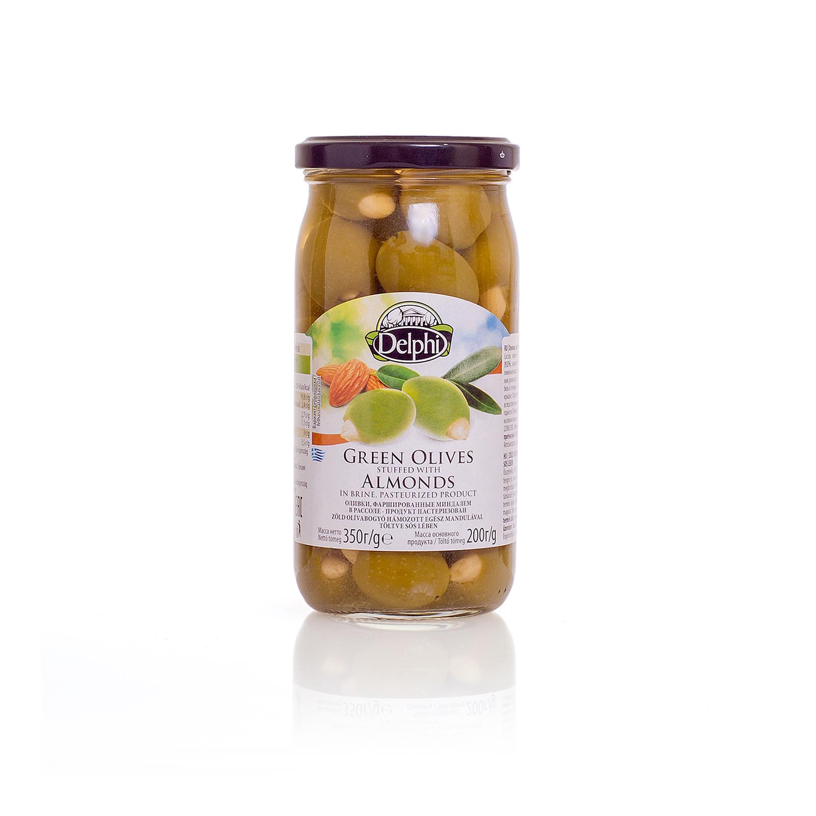 Зеленые оливки Delphi, фаршированные миндалем, являются классическим деликатесом. Хрустящий миндаль и мягкая зеленая оливка, объединившись, делают непревзойденную комбинацию. Крупные зеленые оливки сорта Халкидики (Halkidiki) продолговатой формы с заостренным кончиком. Выращивают оливки сорта «Халкидики» на полуострове Халкидики в северной Греции. Оливки этого сорта созревают рано и их урожай собирают с ноября по декабрь. Благодаря своему крупному размеру , идеально подходят для фаршировки. Оливки фаршируются исключительно вручную. Размер оливок: Colossal 121-140.