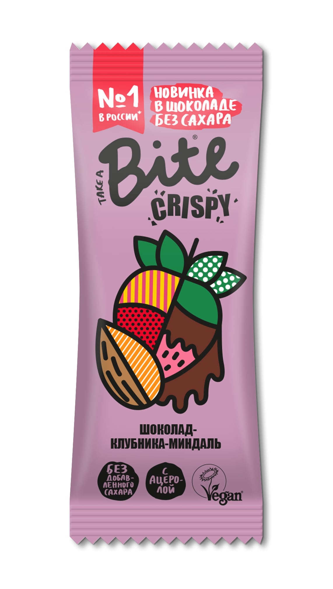 Bite Crispy — это гармоничное и хрустящее сочетание мягкой орехово-фруктовой начинки, кукурузных криспов и тёмного шоколада, приготовленного по швейцарской рецептуре. Шоколад в батончиках Bite Crispy на 75% состоит из какао-бобов и не содержит сахара — он заменяется подсластителем мальтитолом. В этих снеках нет глютена, консервантов, усилителей вкуса и добавленного сахара. Мы добавили в состав батончиков ацеролу (или же барбадосскую вишню), которая содержит в 50 раз больше витамина C, чем апельсин. А еще Bite Crispy подходят для вегетарианцев, веганов и даже астронавтов. В составе батончиков — изысканные сочетания: нежную клубнику дополняет мягкий, сладковатый миндаль.