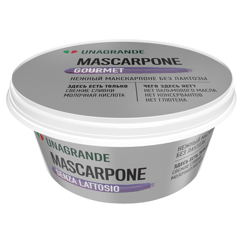 Маскарпоне — итальянская классика. Сыр приготовлен только из свежих сливок специально для людей с непереносимостью лактозы. По вкусу ничем не отличается от классического маскарпоне.