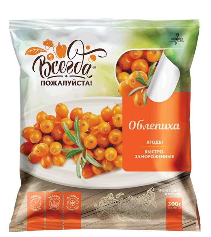 Облепиха известна своими оздоровительными свойствами. В ней содержится большое количество витамина C. В замороженных ягодах облепихи сохраняются все ценные и полезные свойства, так как продукт подвергается шоковой заморозке. Ягоды можно есть в размороженном виде, либо использовать для приготовления морса