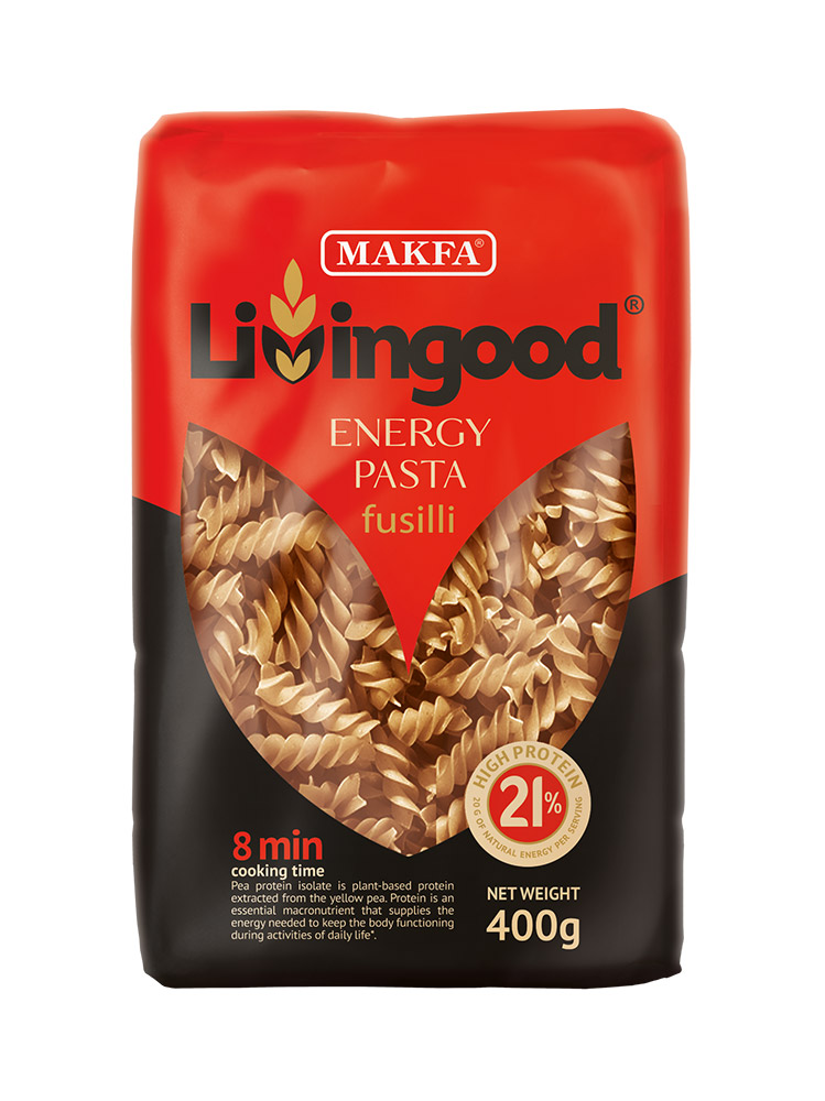 Порция Livingood Energy pasta содержит 21г белка растительного происхождения. В состав Livingood Energy pasta входит изолят горохового белка - высокоочищенный протеин, получаемый из желтого горошка. Белок - это важный макроэлемент, поставляющий в организм энергию. Белки расщепляются и отдают энергию медленнее, помогая дольше оставаться активными. Растительный белок в отличие от животного не содержит холестерина. Для поддержания хорошего самочувствия важно придерживаться разнообразного и сбалансированного питания, а также вести здоровый образ жизни. Livingood делает обычное питание полезнее и разнообразнее.