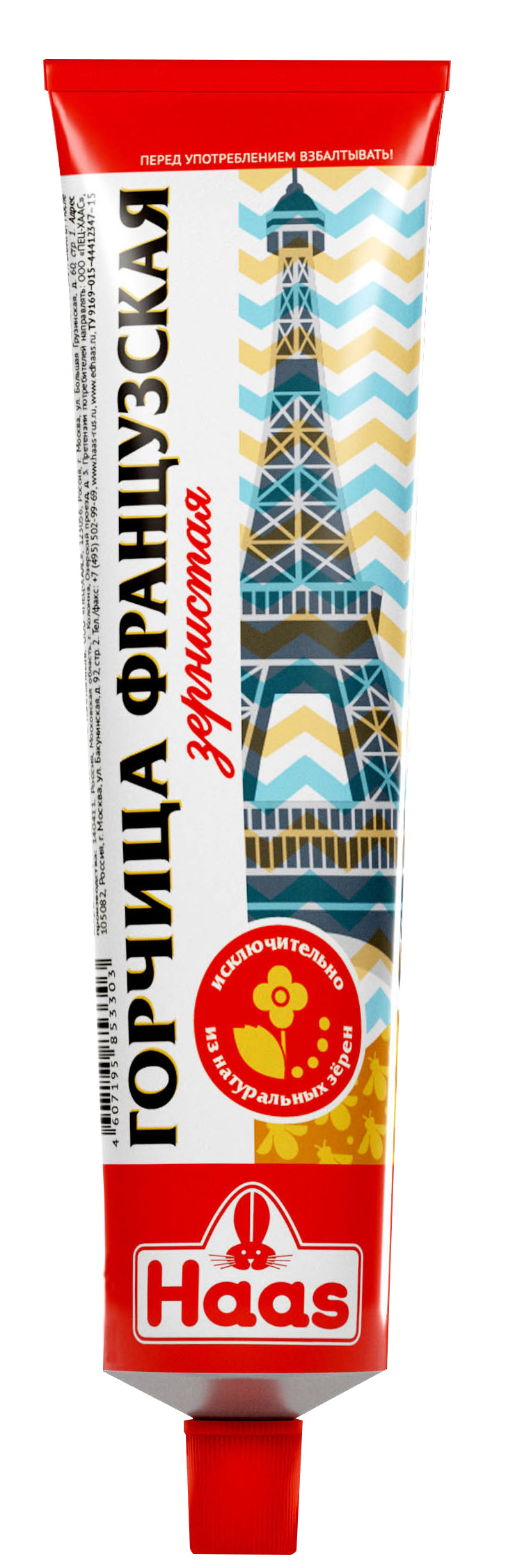 Французская зернистая HAAS с цельными зернами горчицы приготовлена по оригинальной рецептуре. Горчицы в тубах HAAS имеют сбалансированный вкус, нежную однородную консистенцию. Подходят как для мясных, рыбных блюд, так и в качестве заправки для салатов. Уникальная алюминиевая туба герметично защищает от света, сохраняя все полезные свойства и свежесть продукта. Горчица HAAS изготовлена исключительно из натуральных зерен, без горчичного порошка.