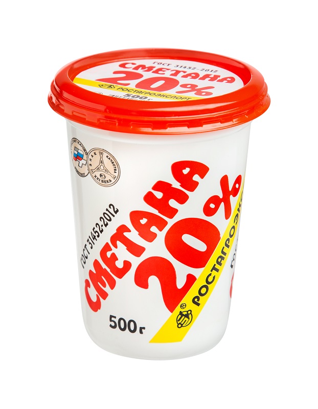Сметана Ростагроэкспорт 20% 500мл приготовлена из нормализованных сливок и закваски без использования консервантов и искусственных добавок. У нее однородная густая консистенция, невысокая кислотность, приятный кисломолочный запах и нежный вкус. Цвет белый с легким кремовым оттенком. Такая сметана прекрасно сочетается с готовыми блюдами, подходит для приготовления соусов и заправок, выпечки и кондитерского крема. Расфасована в пластиковый стакан. За счет натурального состава имеет недолгий срок хранения.
