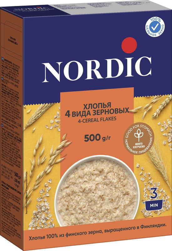 Хлопья Nordic 4 злака из цельного зерна овса, пшеницы, ржи и ячменя. Произведено в Финляндии, не содержит искусственных консервантов, ароматизаторов и красителей.