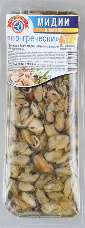 Мясо мидий чилийских отварное, масло подсолнечное рафинированное дезодорированное, сахар, соль (содержит антислеживающий агент Е536), уксусная кислота пищевая, регуляторы кислотности: лимонная, винная, яблочная и молочная кислоты, консерванты бензоат натрия и сорбат калия, ароматизатор пищевой натуральный. Возможно наличие следов ракообразных.