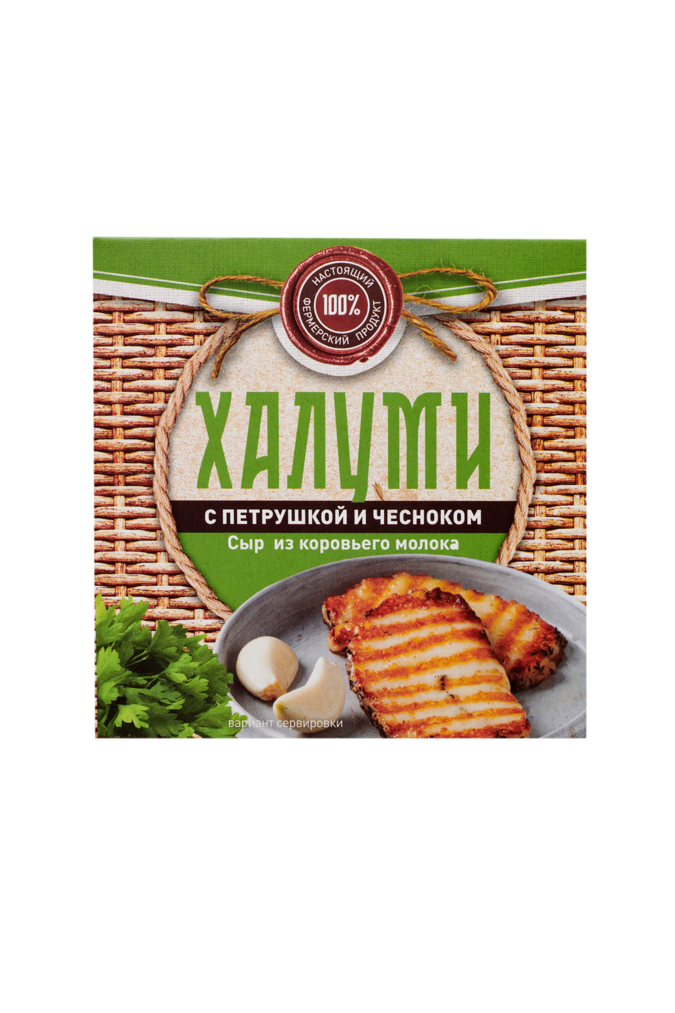 Полутвердый сыр для жарки ХАЛУМИ с чесноком и петрушкой, массовая доля жира 50%, имеет круглую форму. Консистенция плотная, слоистая. Поверхность сыра без корки, покрыта молотой сухой петрушкой. Вкус чистый, свежий, сладковатый, молочный, умеренно соленый, с привкусом и ароматом чеснока и петрушки. Однородная масса, цвет от белого до светло-желтого, однородный по всей массе. Интенсивность цвета зависит от качества и сезонности молока. С вкраплениями частиц сухой петрушки.