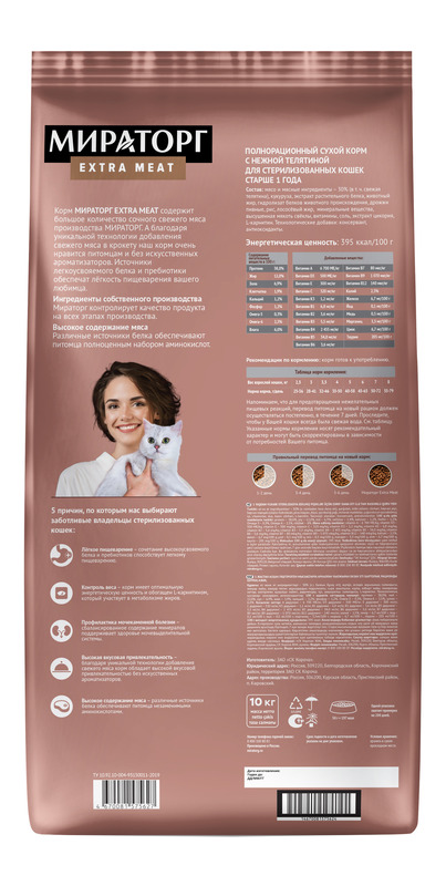 Корм сухой для стерилизованных кошек старше 1 года с нежной телятиной Мираторг Extra Meat 10кг