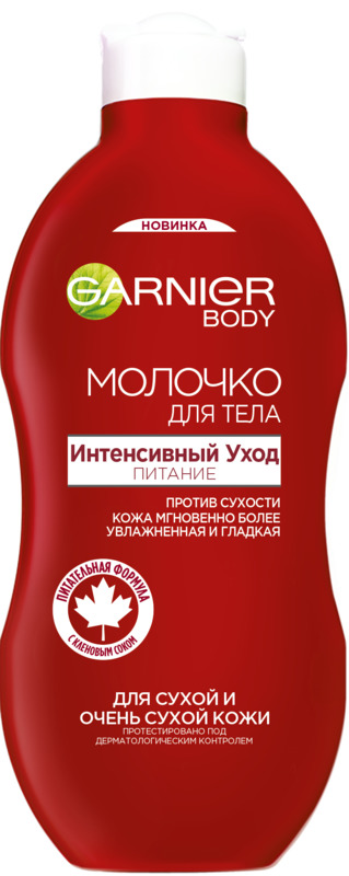 Когда кожа тела сухая, может возникать чувство стянутости, она может стать грубой. Garnier заботится о Вас: 1) Молочко для тела "Интенсивный уход, питание". Питательная формула для сухой кожи с кленовым соком, известным своими питательными свойствами. Формула интенсивно питает и заметно смягчает кожу, придает ощущение комфорта. Формула заметно разглаживает и защищает кожу тела от сухости, вызванной холодом и другими негативными факторами окружающей среды. 2)Нежная питательная текстура. Придает коже тела мягкость и естественное сияние
