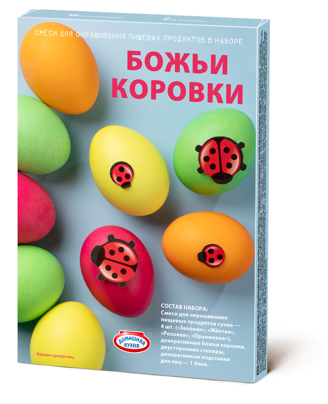 Набор для окрашивания и декорирования пасхальных яиц. Яркие и сочные цвета для окрашивания пасхальных яий и наклейки в видке божьих коровок для декорирования.