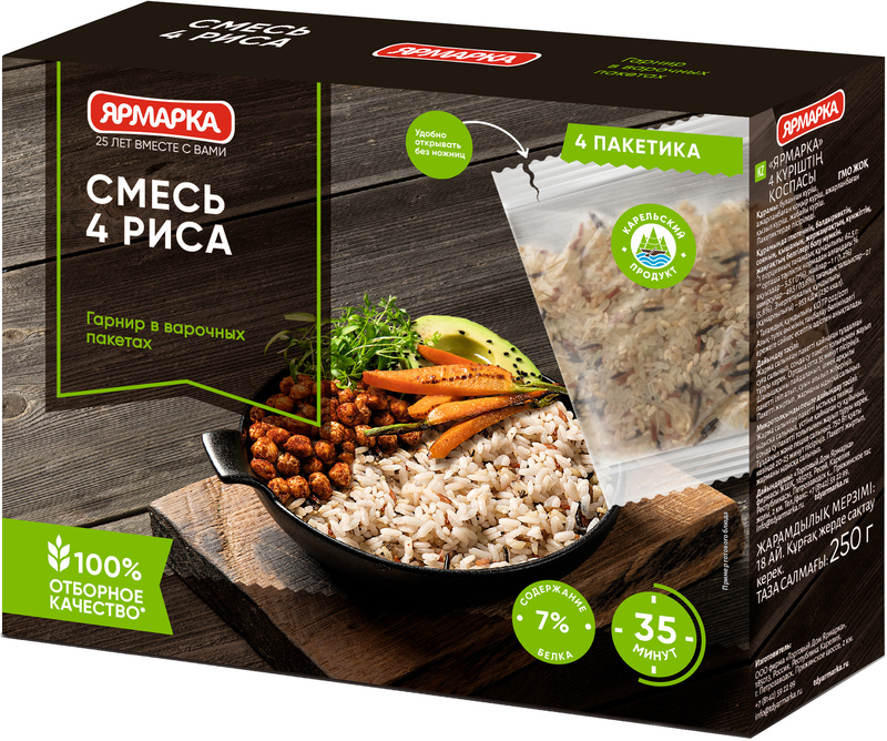 Смесь 4 риса «Ярмарка Отборная» — это оригинальная смесь четырех разных рисов. Простая и универсальная в использовании, отличный вариант для приготовления полезных и питательных гарниров и салатов, прекрасно сочетается с мясом, курицей и рыбой.