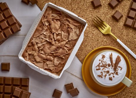 Паровой шоколадный бисквит, мусс на основе молочного шоколада с добавлением молочных сливок. Украшен стружкой собственного производства из бельгийского шоколада.