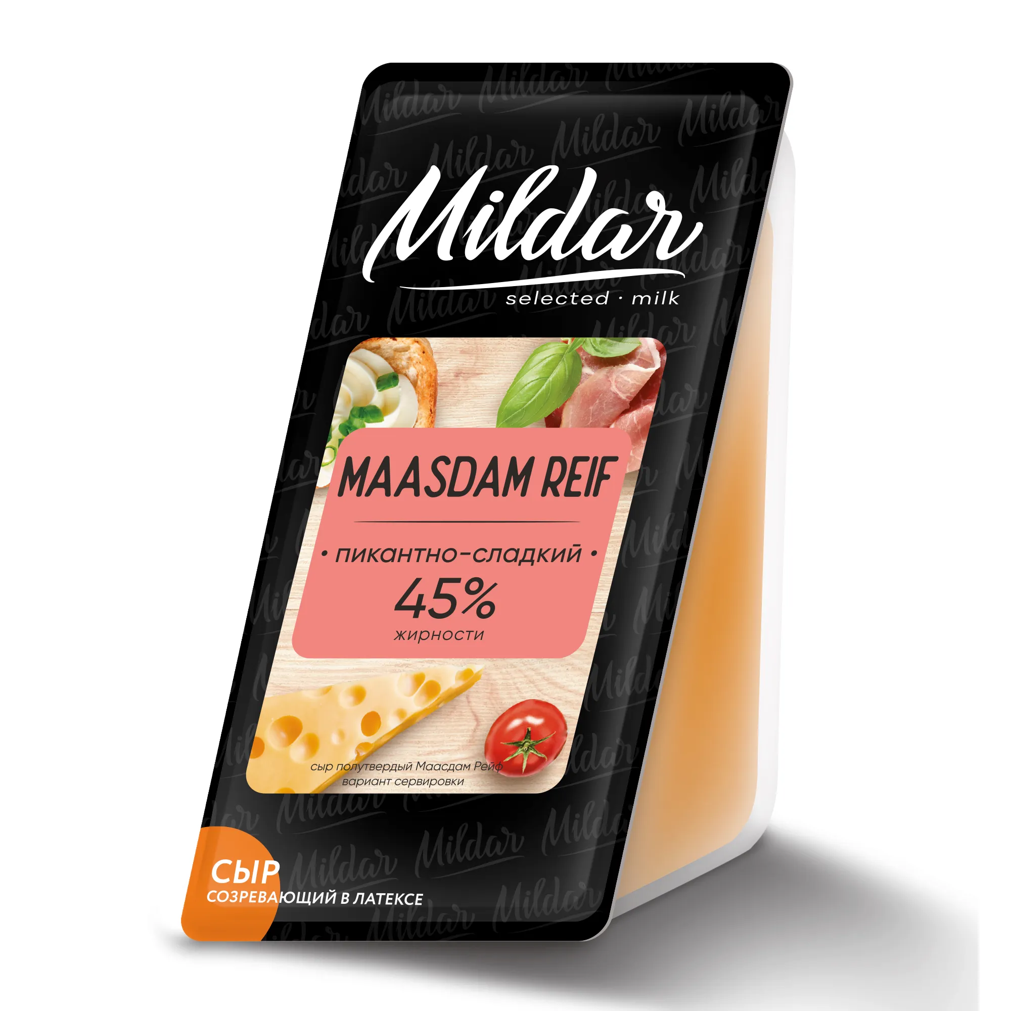 Сыр Maasdam Reif - полутвердый сыр натурального созревания. Сыр желто-золотистого цвета, с большими глазками правильной формы, плотный и маслянистый по своей консистенции. Обладает тонким ореховым ароматом и пикантно-пряным сливочным вкусом. Аромат сыра узнаваемый - острый со сладковато-ореховыми нотками.