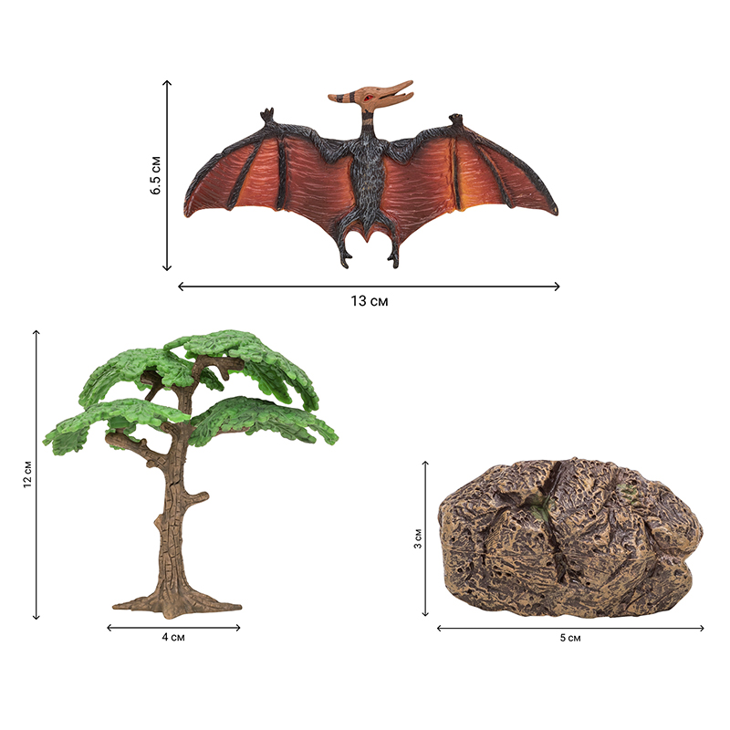 В набор входит 7 фигурок: птеродактиль, диметродон, тиранозавр, троодон, велоцираптор, дерево, камень.