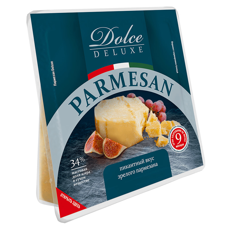 Пармезан Dolce Deluxe – это самый зрелый сыр, он зреет 9 месяцев, поэтому он имеет такой аромат и насыщенный вкус, он пикантен своей умеренной солоноватостью. Dolce Deluxe легко крошится на кусочки. Пармезан рекомендуется использовать для приготовления салатов, пиццы, лазаньи, пасты. Подойдет в качестве закуски к сухому белому и красному вину.