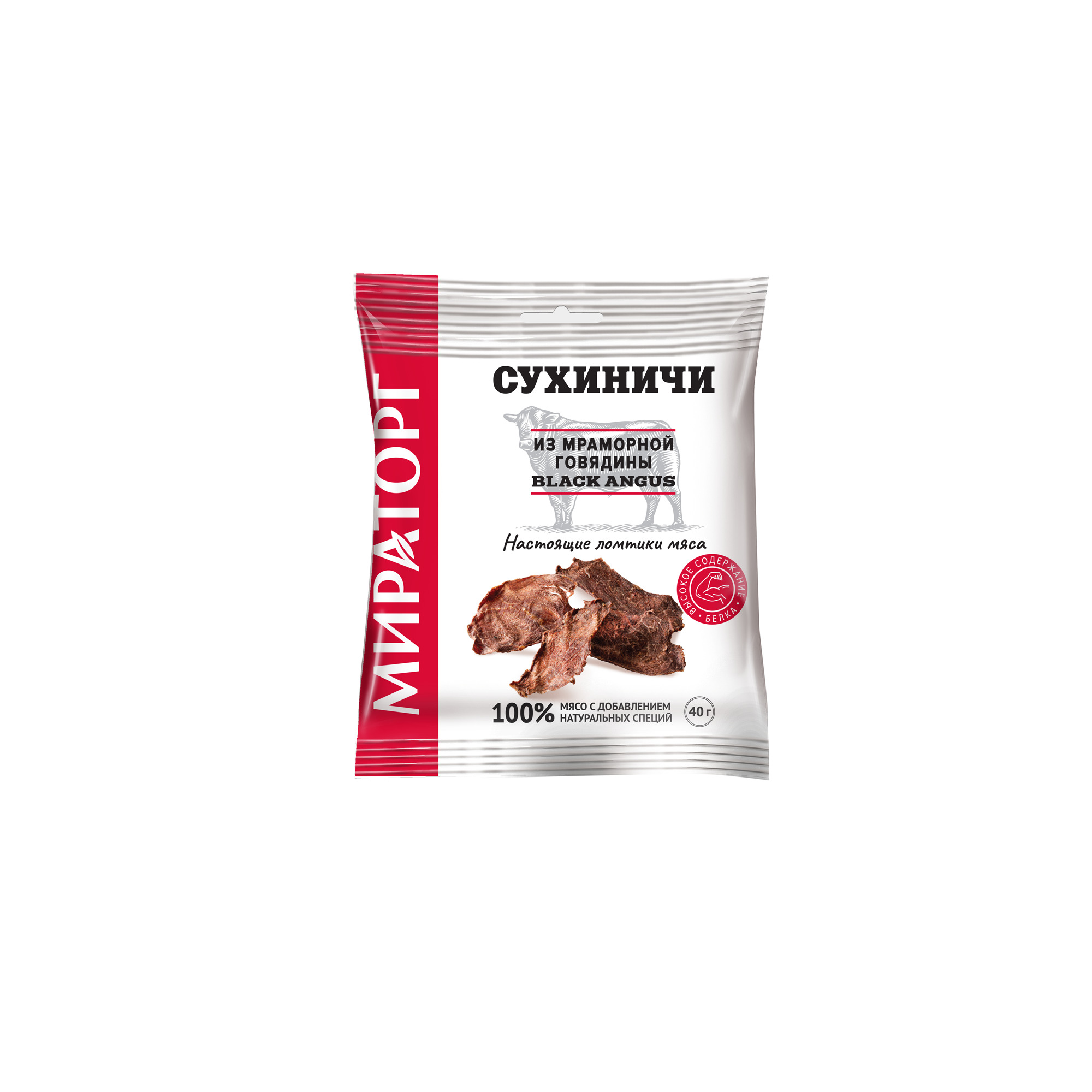 Сухиничи от Мираторг изготовлены из отборной мраморной говядины Black Angus с добавлением душистых пряностей и ароматных сушеных овощей. Благодаря оптимальной температуре сушки, в мясном ломтике сохраняются все питательные свойства говядины. Сухиничи отлично утоляют голод, богаты белком и имеют высокую энергетическую ценность.