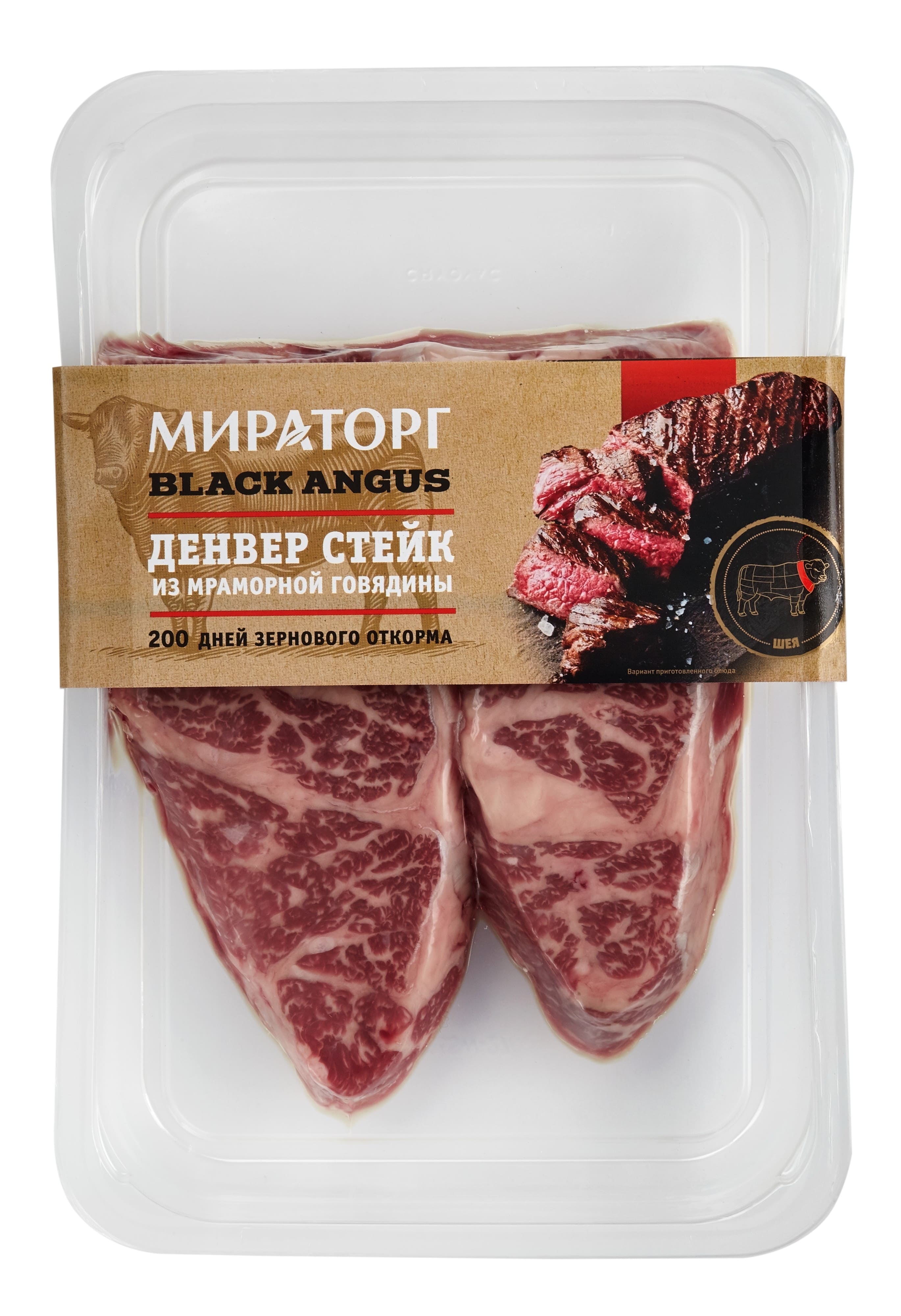 Денвер стейк нарезается из филе шейного отруба и обладает высокой мраморностью. Среди прочих стейков Денвер выделяется своей необычной продолговатой формой и крупными волокнами. Вкусовые качества мяса лучше всего раскрываются при жарке.