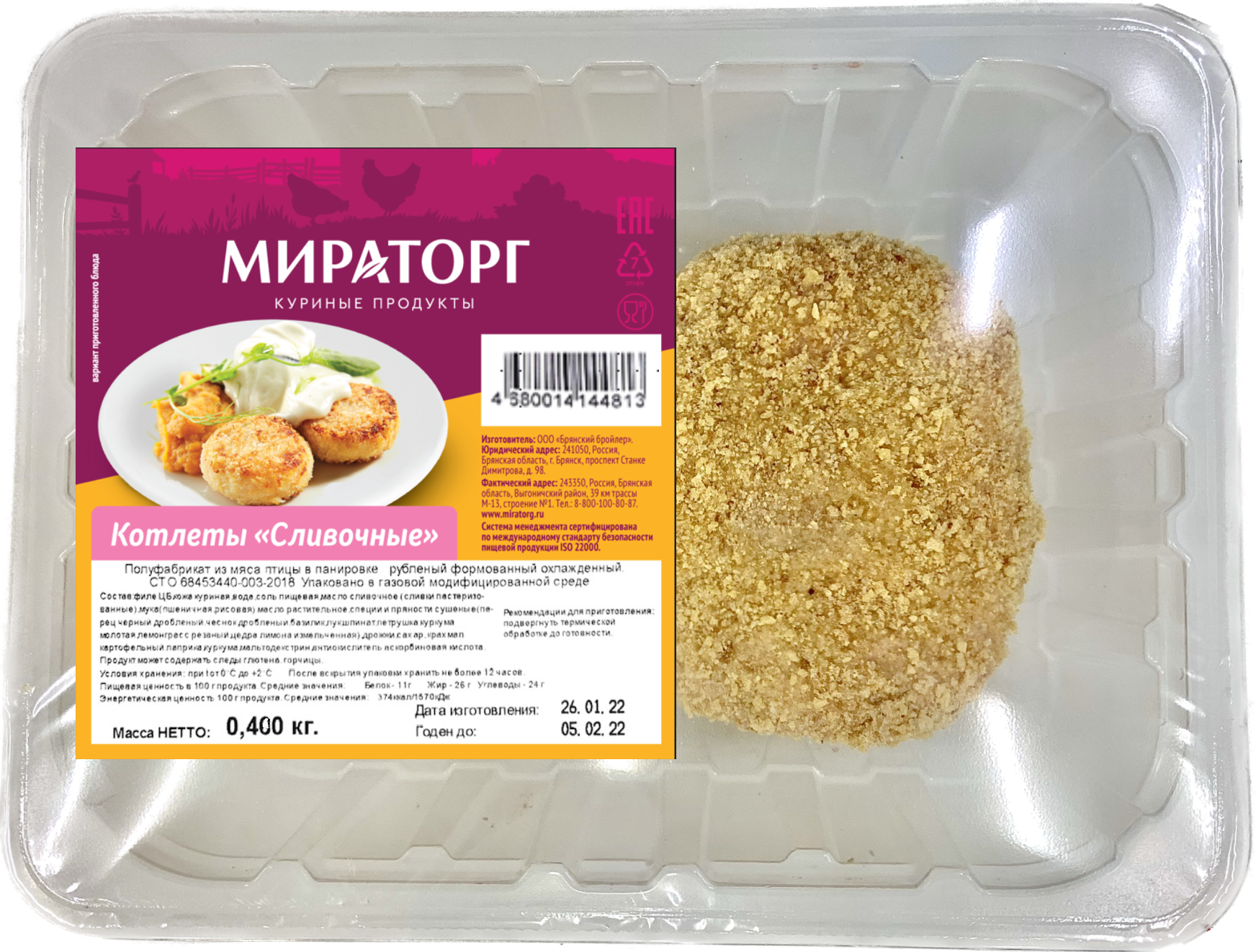 В состав входят натуральные сливки, которые придают котлете характерный сливочный вкус и аромат.