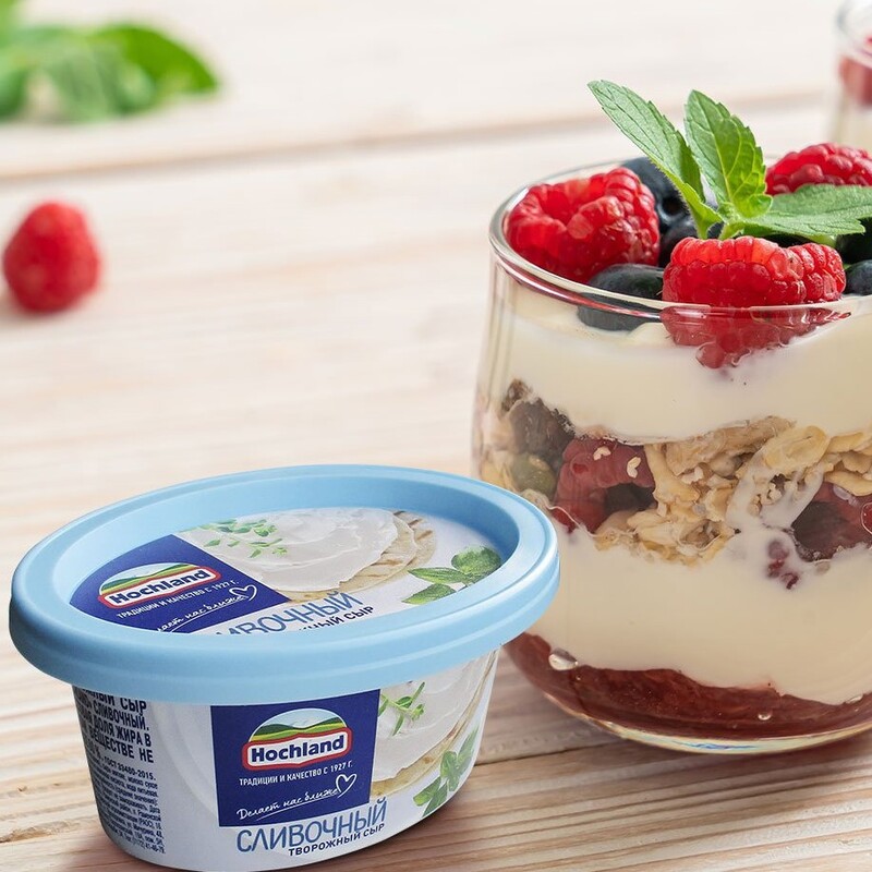 Творожный сыр Hochland сливочный сделан из творога, приготовленного из натуральных сливок и молока. Сыр обладает универсальным нежным сливочным вкусом, который гармонично дополнит бутерброд с любой начинкой. Например, он идеально подходит для бутербродов и сэндвичей на завтрак и отлично сочетается с солоноватой красной рыбой, спелым авокадо и овощами. Благодаря кремовой нежной текстуре сыр легко намазывается на хлеб. Также сыр предназначен для создания сладких ягодных аккомпанементов для блинчиков и оладий.